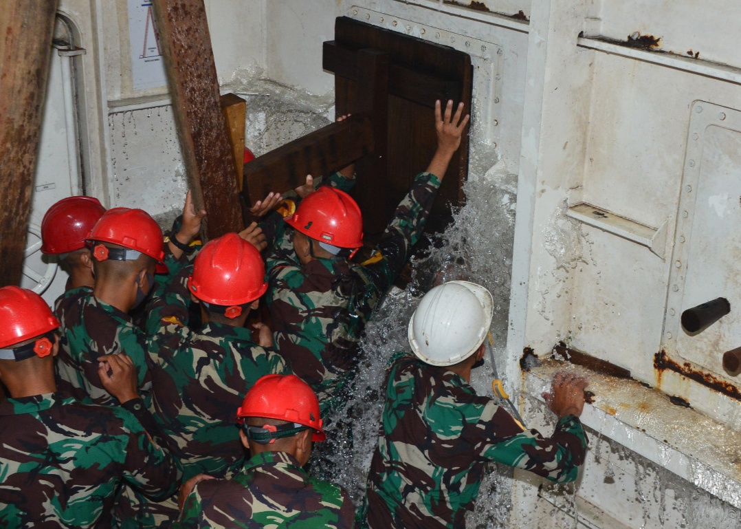 Latihan penanganan kebocoran kapal ini, lanjutnya, dilaksanakan di Damage Control Simulator Puspeknubika, alat ini mirip dengan kabin kapal yang sesungguhnya, dimana terdapat berbagai macam jenis retakan/ kebocoran di dinding kapal, jika dialirkan air bertekanan tinggi melalui retakan tadi terlihat seperti layaknya kebocoran di kapal yang sebenarnya, apalagi simulasi kapal ini dapat melakukan oleng dan angguk, membuat suasana seperti benar-benar berada di kabin kapal yang mengalami kebocoran.