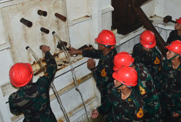 Dengan bekal peralatan tersebut, para Taruna yang dibagi dalam beberapa kelompok Tim Penanggulangan Kebocoran, bergantian melaksanakan penanggulangan kebocoran kapal sesuai dengan jenis kebocoran.