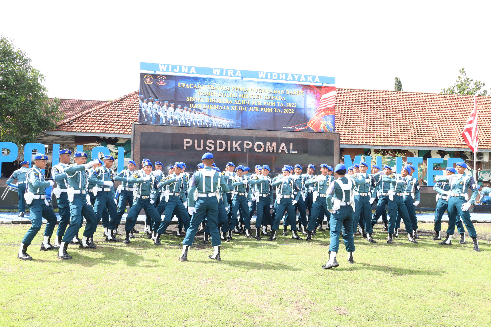 Bertempat di Lapangan Dharma Wira Satya Pusdikpomal, Kodiklatal Bumimoro Surabaya, Senin (13/2/2023) Danpuspomal Brigjen TNI (Mar) I Made Wahyu Santoso memimpin langsung Upacara Penganugrahan Baret Korps Pomal kepada 45 orang siswa, yang terdiri dari 21 orang siswa Pendidikan Pertama Bintara (Dikmaba), dan 24 orang siswa Pendidikan Pertama Tamtama (Dikmata) TNI AL Angkatan XLII Gelombang 1 TA 2022.