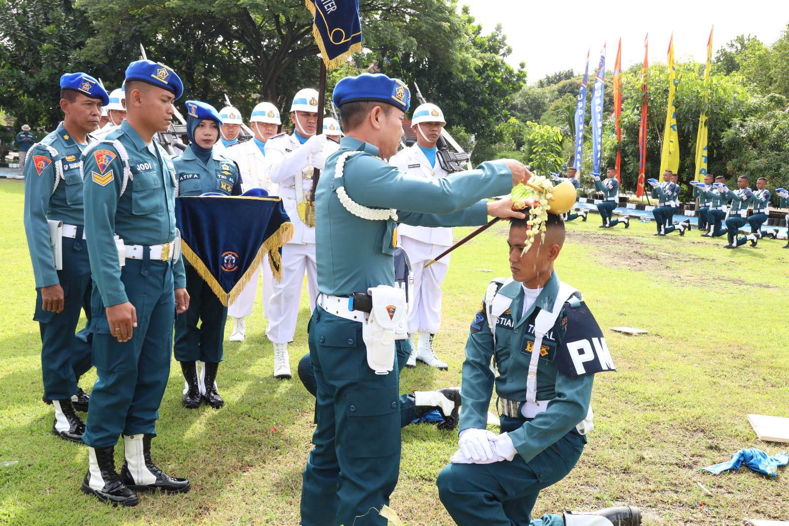 Upacara penganugerahan baret Pomal diwarnai dengan tradisi pemberian air bunga oleh Danpuspomal yang disiramkan ke kepala salah satu siswa. Ini merupakan simbol doa restu dari orang nomor satu di jajaran Pom TNI AL kepada seluruh siswa , atas diterimanya mereka menjadi bagian dari keluarga besar Pomal. Selanjutnya Danpuspomal mengenakan baret biru Pomal kepada siswa.