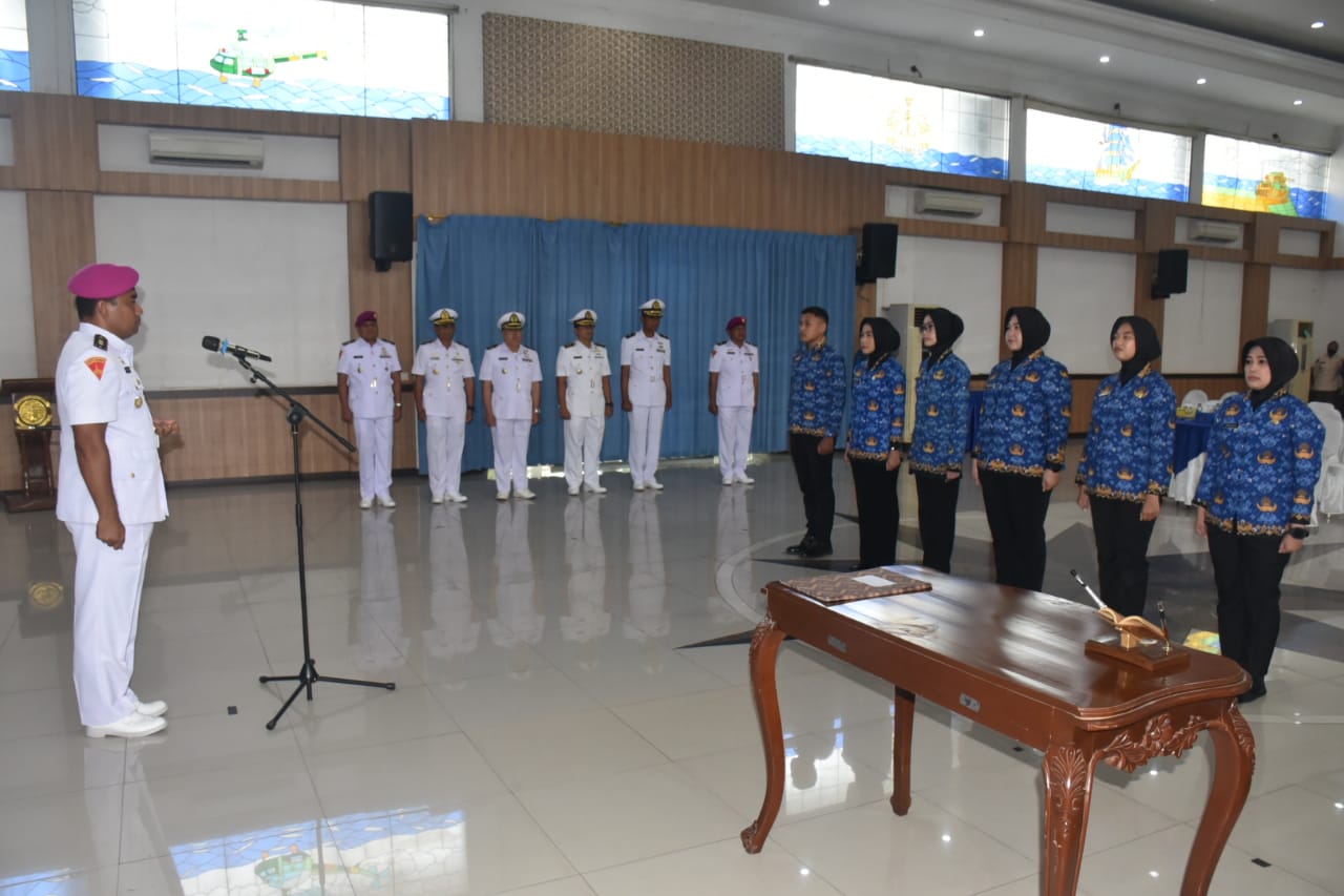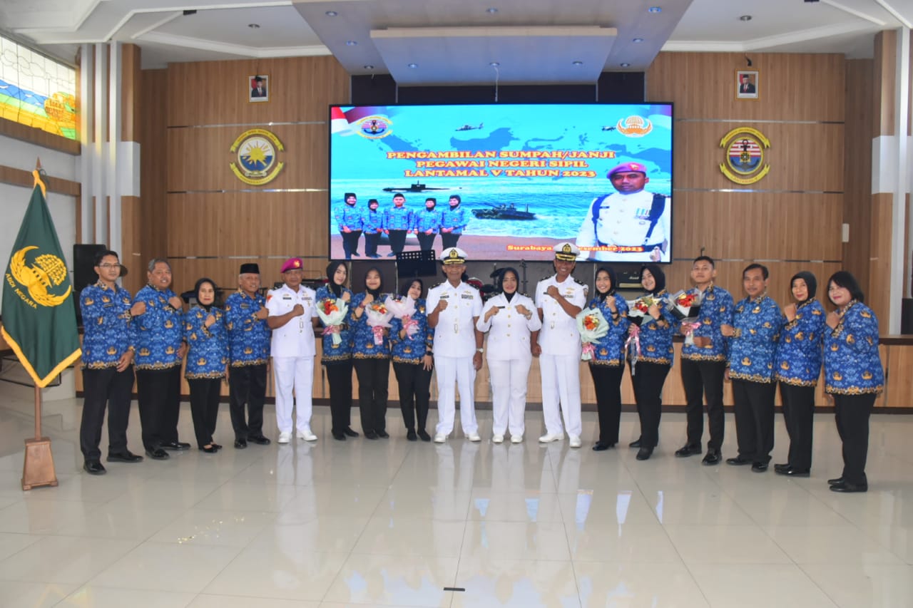 Sebanyak 6 Pegawai Negeri Sipil (PNS) Pangkalan Utama TNI AL (Lantamal) V melaksanakan pengambilan sumpah sekaligus pelantikan sebagai PNS baru di jajaran Lantamal V Tahun 2023 yang dipimpin oleh Komandan Detasemen Markas (Dandenma) Lantamal V Letkol Marinir Fauzi Safii, S.A.P., M. Tr. Opsla di Gedung Serbaguna Lantama V Perak Surabaya. Kamis (14/12/2023).