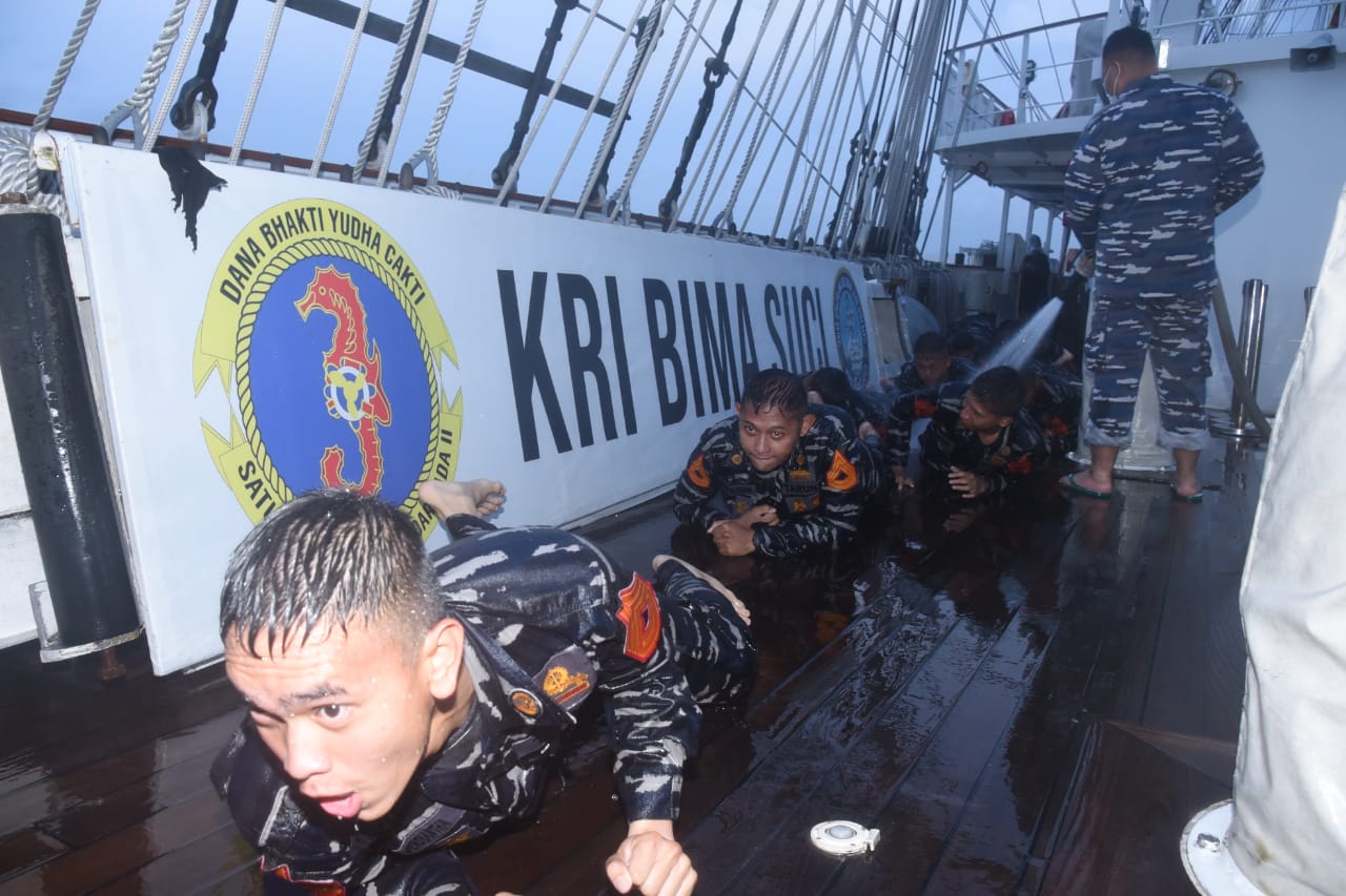Tampak hadir Dansatgas KJK tahun 2021 Letkol laut (P) Waluyo, S.E., M.Tr. Hanla., Palaklat KJK tahun 2021 Letkol Laut (P) Pungki Kurniawan, Palaksa KRI Bima Suci Mayor Laut (P) Sugeng Hariyanto, M.Tr. Opsla., serta Perwira KRI Bima Suci dan Perwira Staflat lainnya.