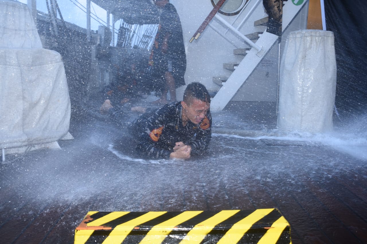Pada pelayaran di Etape ke – 8 dari Tarakan Kaltara menuju Ranai, 89 Taruna Akademi Angkatan Laut (AAL) Tingkat III Angkatan 68, Satuan Latihan Kartika Jala Krida (KJK) tahun 2021 yang berlayar keliling Indonesia dengan KRI Bima Suci mengalami moment istimewa Mandi Kathulistiwa saat melintasi titik “0” di Selat Karimata, Sabtu (25/9) dini hari tadi.