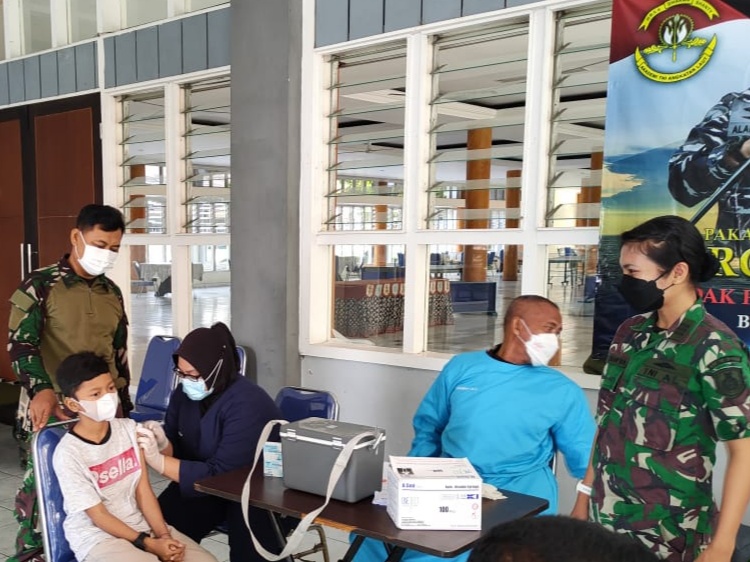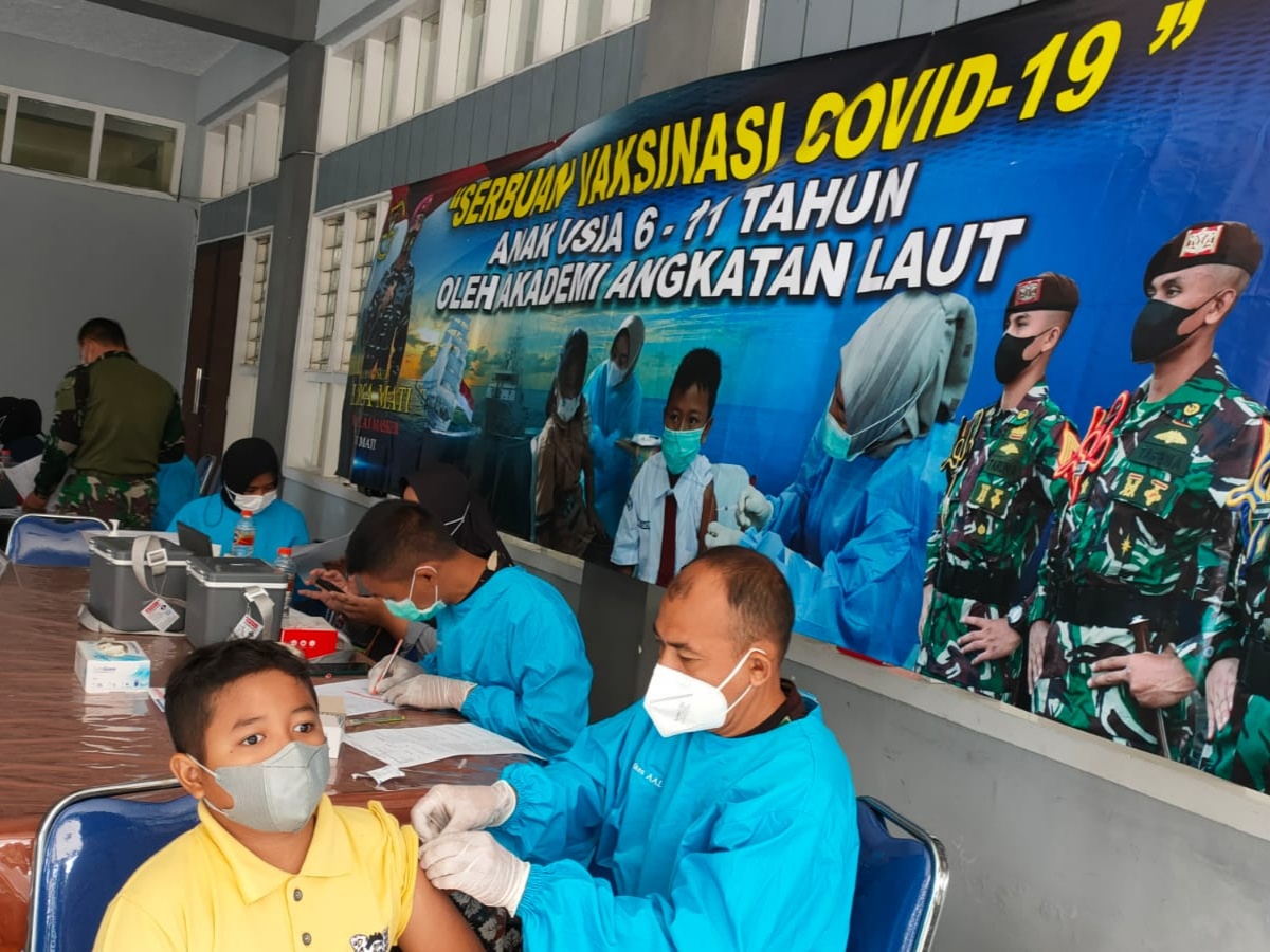 Setelah 20 Desemer lalu lancarkan Serbuan Vaksinasi Maritim TNI AL di SD Hang Tuah 10 Juanda, secara bertahap Akademi Angkatan Laut (AAL) terus lanjutkan program vaksinasi untuk anak usia 6-11 tahun, kini sasaran diarahkan kepada putra putri personel AAL secara bergilir, sedikitnya 78 anak sudah tervaksin yang digelar di Gedung Mandala, Kesatrian AAL Bumimoro, Surabaya, Rabu (29/12).