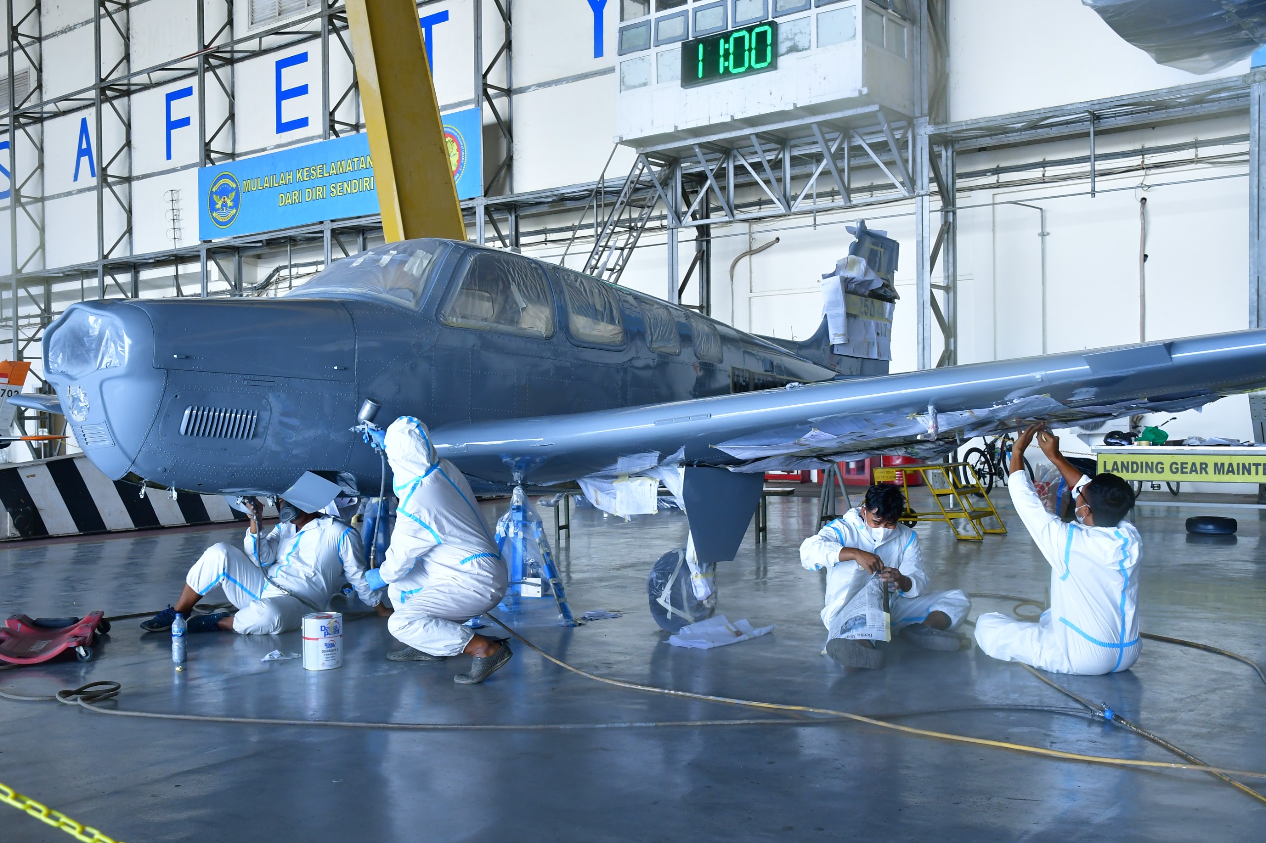 Agar tampil baru dan fresh, prajurit Depram (Departemen Rangka Akp Mesin) Fasilitas Pemeliharaan dan Perbaikan Pesawat Udara (Fasharkan Pesud) Puspenerbal, melaksanakan painting pesawat Bonanza G-36 nomor Lambung T-2504 bertempat di Hanggar 1 Fasharkan Pesud, Hari Selasa (23/7/2024).