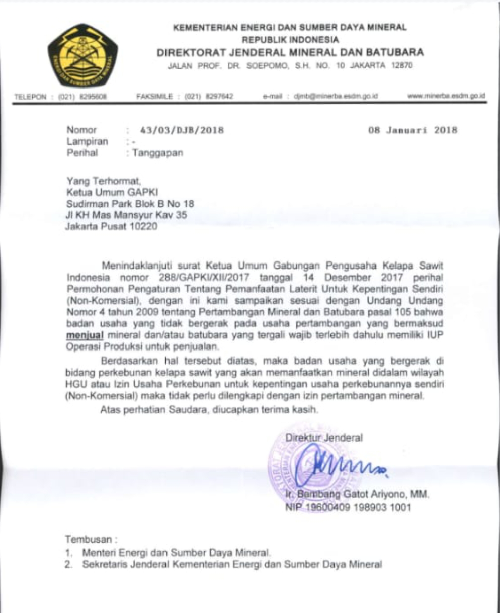 Surat yang ditujukan kepada Ketua Umum GAPKI menyebutkan, bahwa badan usaha perkebunan yang memanfaatkan mineral dalam wilayah HGU. Untuk kepentingan sendiri (non-komersial) tidak memerlukan izin pertambangan mineral.