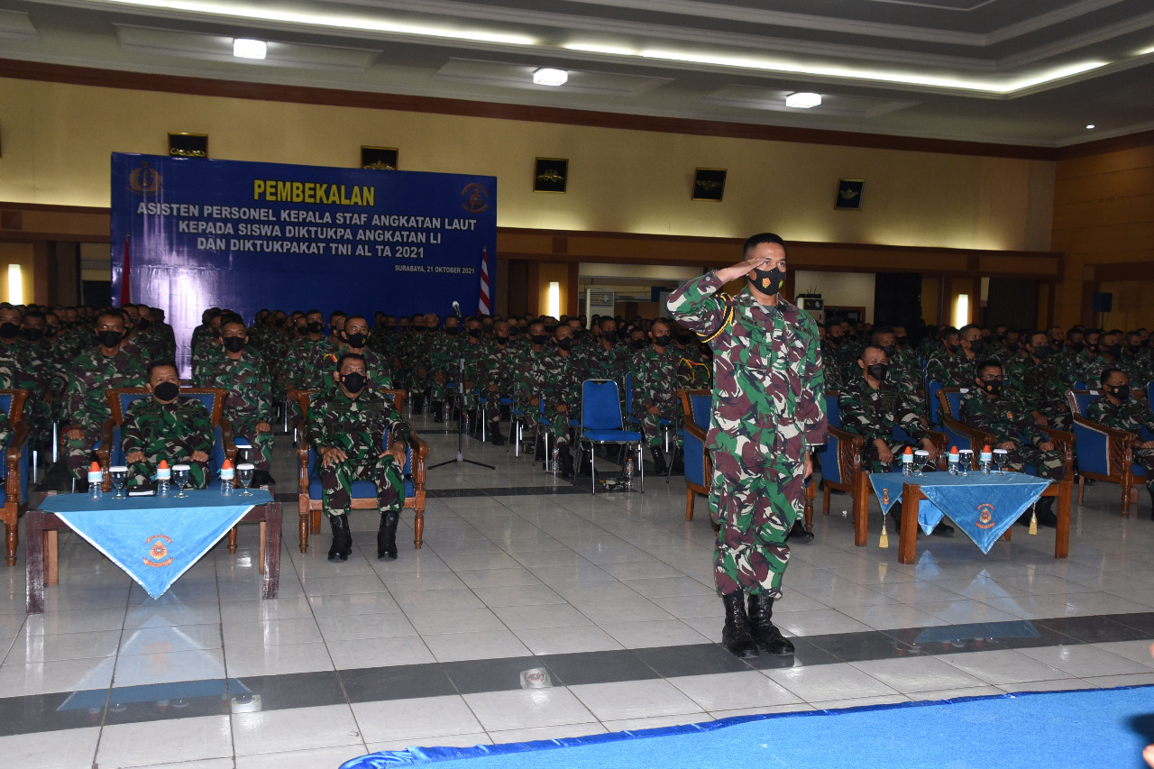 Dalam pembekalan tersebut Aspers Kasal berada di Ruang Auditorium Mabesal Jakarta sedangkan para siswa yang berjumlah 758 siswa Diktukpa dan Diktupakat berada di Gedung Moeljadi dan Gedung R.E Martadinata Kesatrian Kodiklatal Bumimoro Surabaya, Jumat, (22/10/2021).