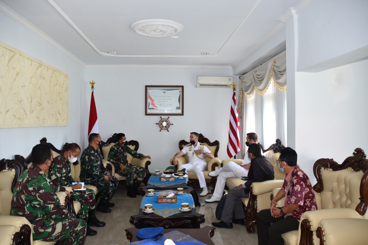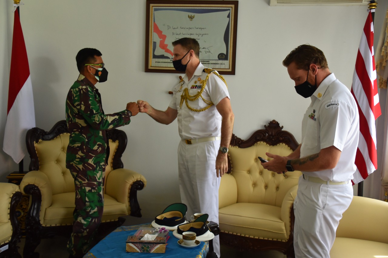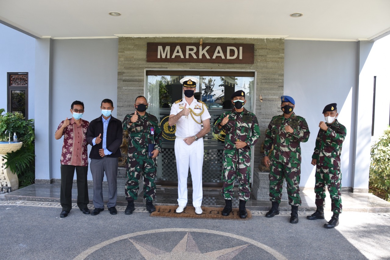 Komandan Pangkalan TNI AL (Danlanal) Denpasar Bali Kolonel Laut (P) I Komang Teguh Ardana, S.T., M.A.P., menerima Kunjungan Kerja Atase Pertahanan Australia CAPT RtH Griffiths. CSM. RAN dari Australian Naval Attache Jakarta, di Lobby Mako Lanal Denpasar Jalan Raya Sesetan 331 Denpasar Bali, Senin (9/8/2021).