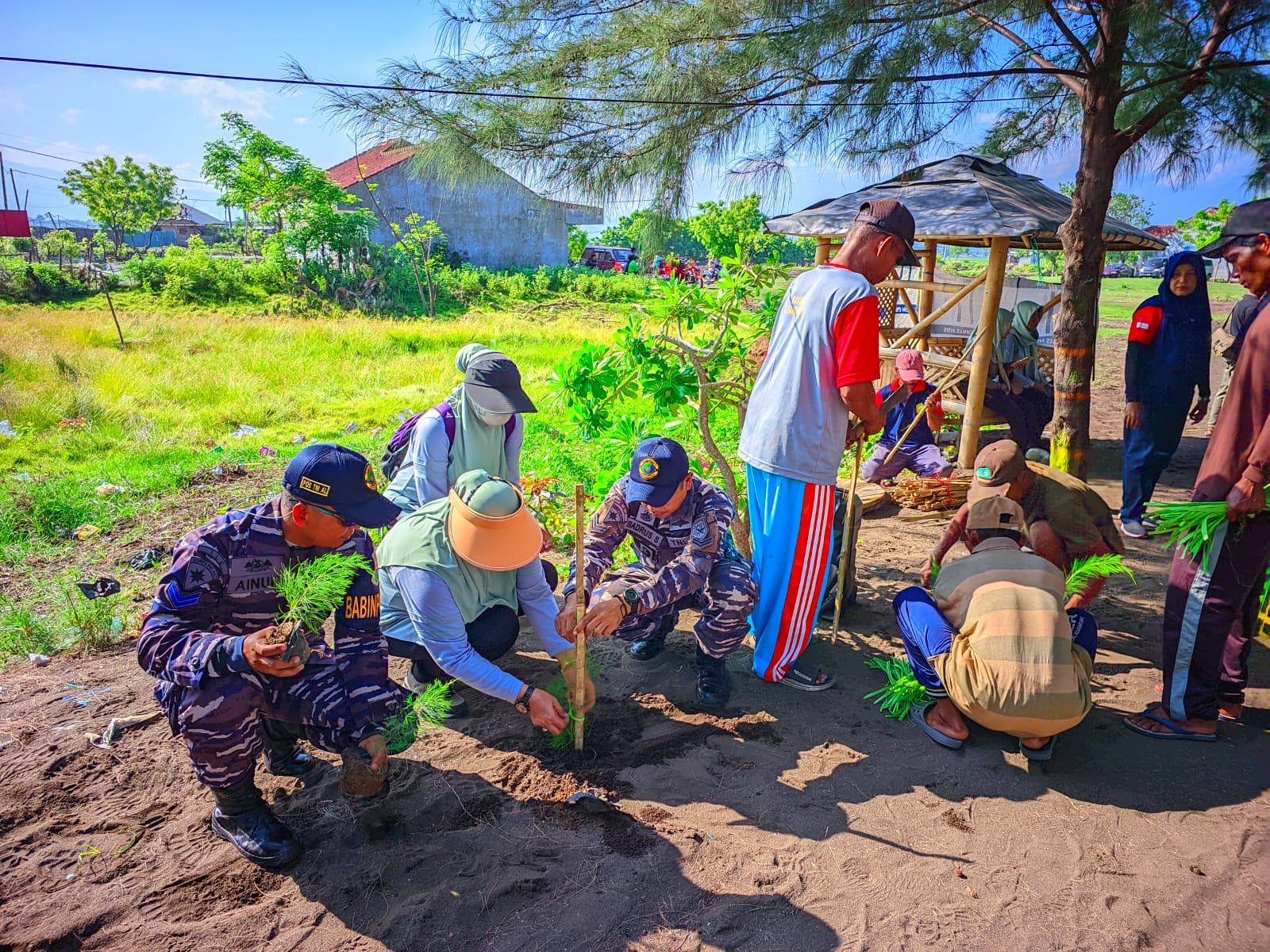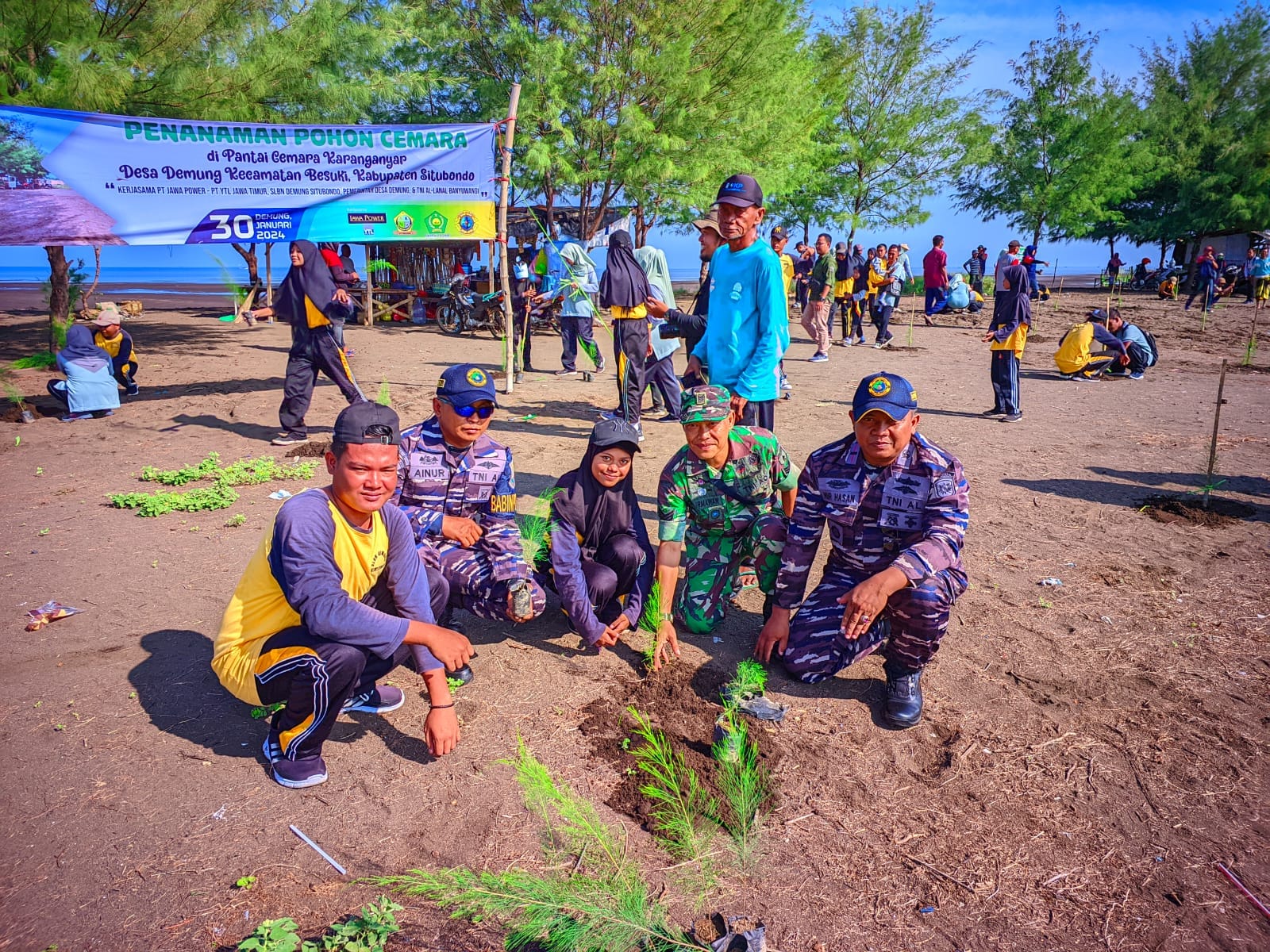 Bintara Pembina Potensi Maritim (Babinpotmar) Pangkalan TNI AL (Lanal) Banyuwangi dalam hal ini Pos Keamanan Laut Terpadu (Poskamladu) Panarukan yang dipimpin Danposkamladu Letda Laut (P) Nur Hasan menggaungkan gerakan menghijaukan pesisir pantai dengan melaksanakan penanaman bibit pohon cemara di Pantai Cemara Karanganyar Desa Demung Kecamatan Besuki Kabupaten Situbondo. (30/1/2024).