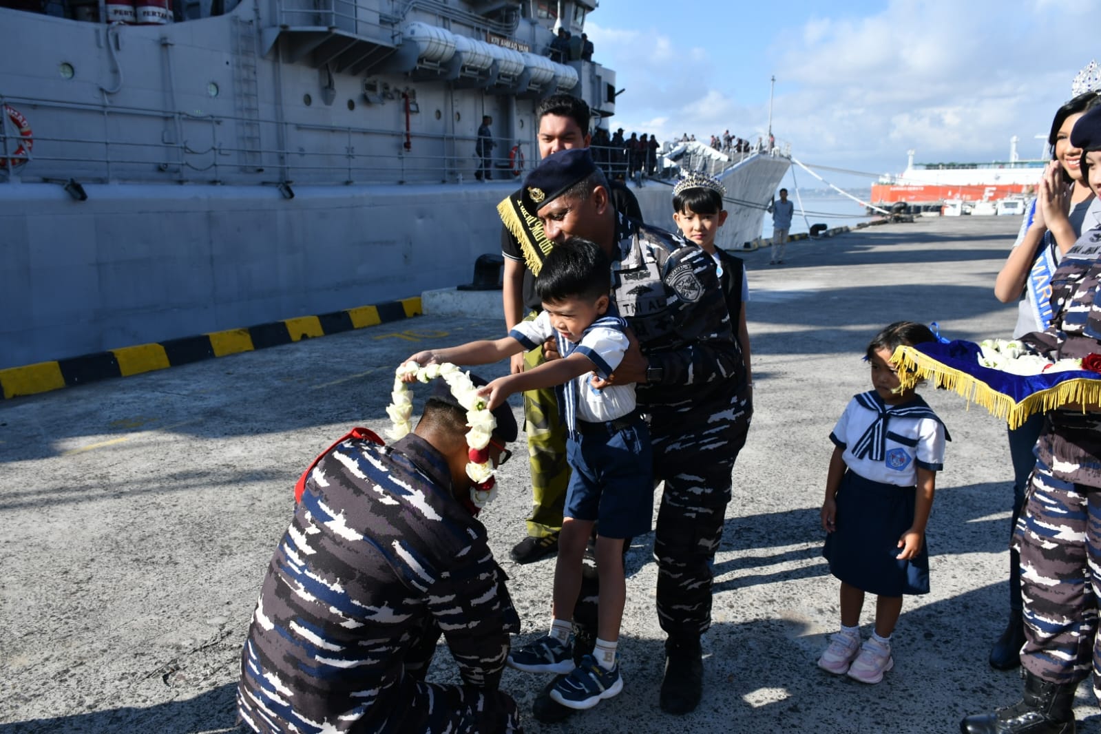 Ratusan warga Bali menyerbu KRI Ahmad Yani-351 yang merupakan salah satu alutista tergabung dalam Satuan Tugas Operasi Trisila-24 Tahap 3 Koarmada II TA. 2024. Tidak hanya itu warga berbondong-bondong dengan antusias menyaksikan langsung prosesi penyambutan Satgas Operasi Trisila TNI AL tersebut yang berlangsung di Dermaga Timur Pelabuhan Benoa Bali. Senin (15/7).