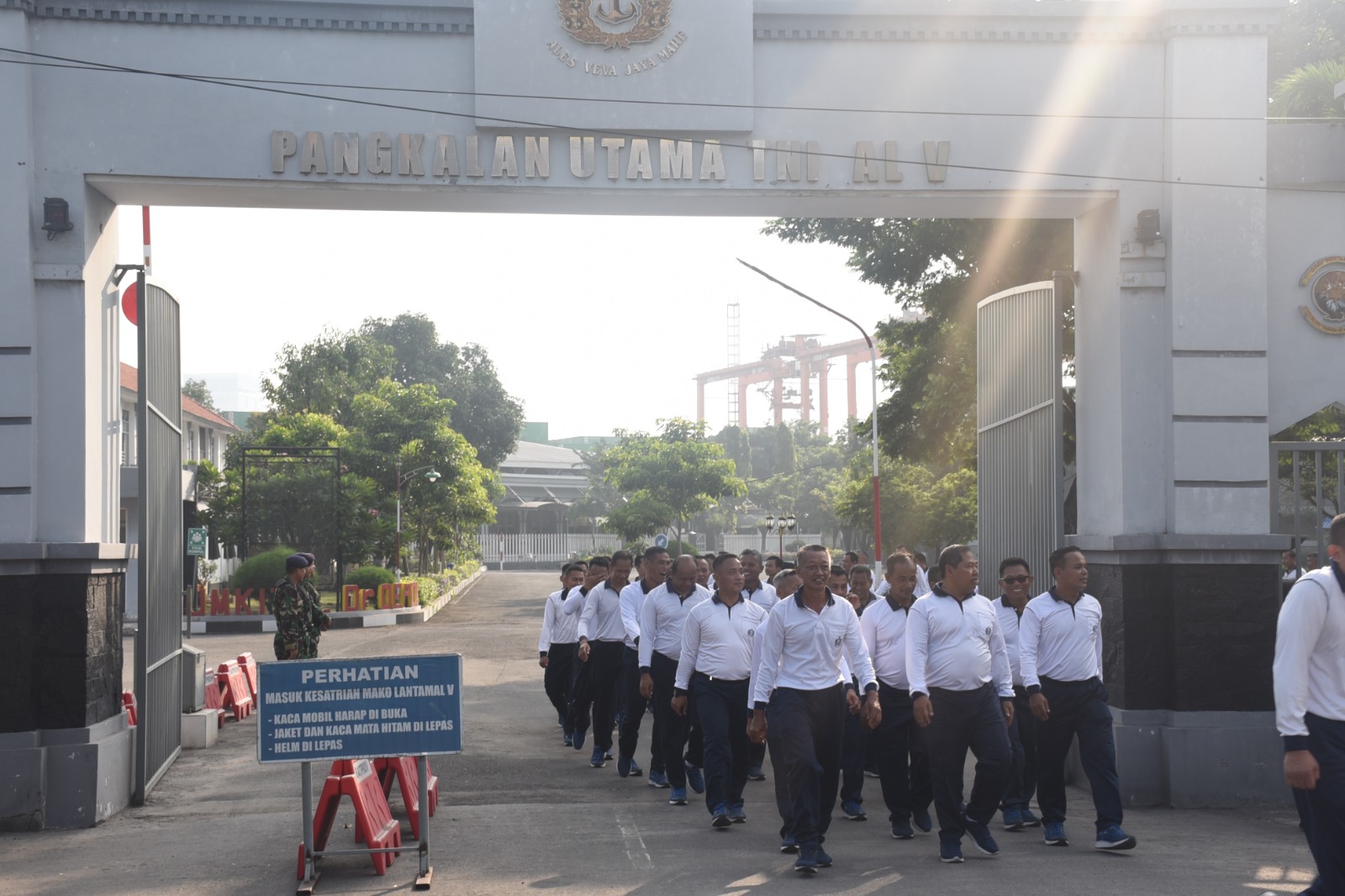 Setelah melaksanakan apel pagi seluruh personel melaksanakan senam SKJ 88 yang dipimpin oleh tim jasrek Lantamal V, kemudian dilanjutkan dengan jalan sehat mengelilingi sekitaran Mako Lantamal V.