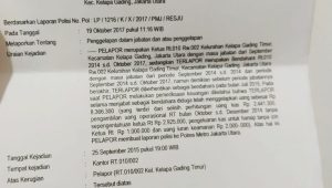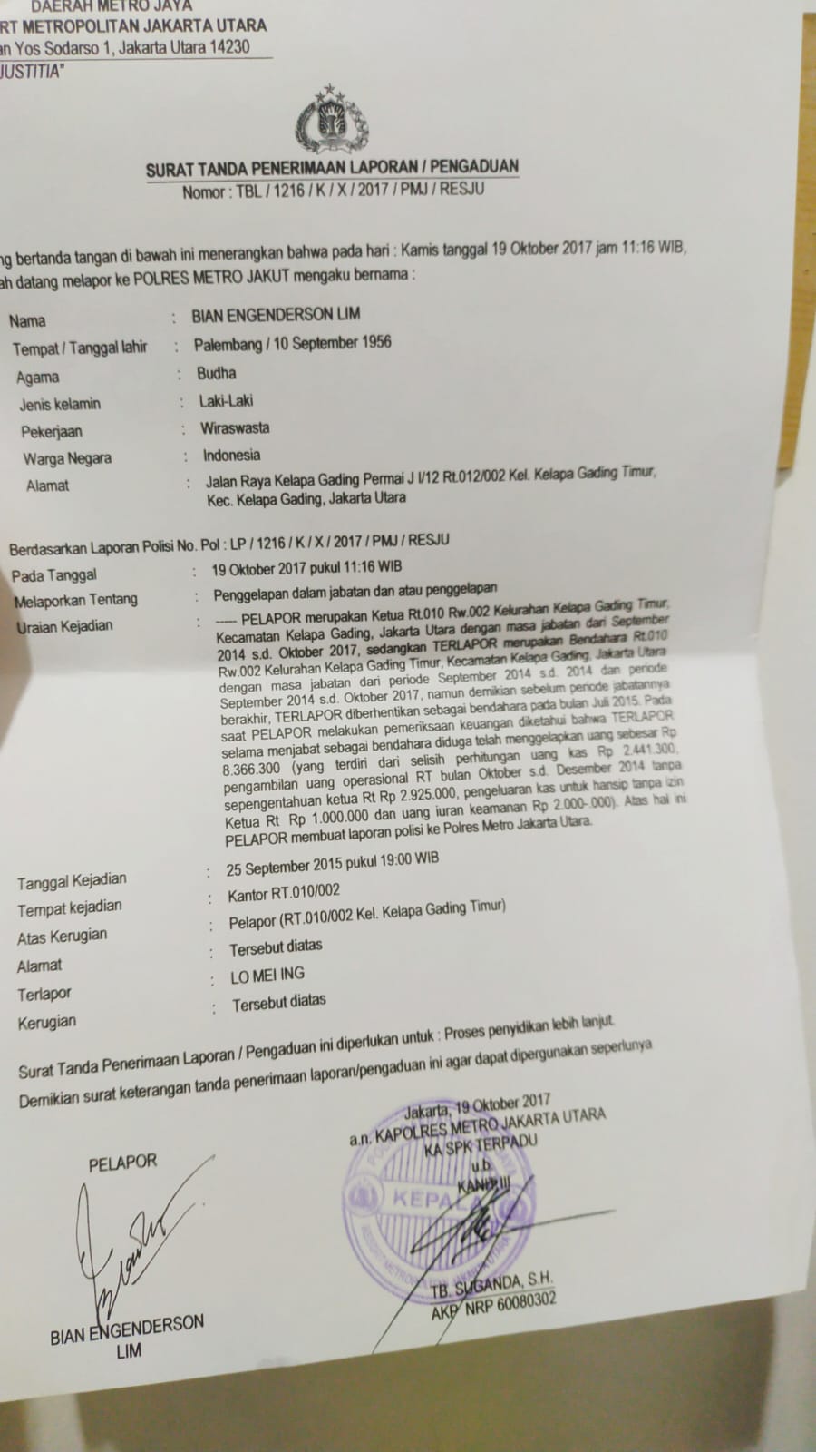 Terlapor diberhentikan dari jabatannya sebagai Bendahara RT pada tahun 2015 sebelum masa periode berakhir karena diduga telah menggelapkan uang organisasi RT sebesar Rp 8.366.300. Selanjutnya terlapor dilaporkan oleh ketua RT yang saat itu dijabat oleh Bian Engenderson Lim.