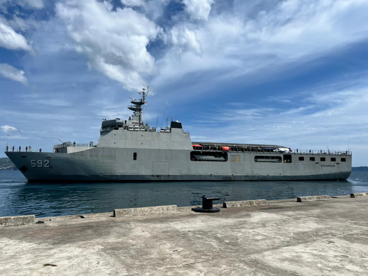 KRI Banjarmasin- 592 yang dikomandani Kolonel Laut (P) Yohanes Berchmans Cahyono, kembali melanjutkan tugas Operasi Trisula Jaya-26 Angkutan Laut Mendukung Satgas PAMTAS RI – PNG Mobile Kewilayahan TA. 2026 dengan membawa 900 personel dari Yonif 623/XX1/TB dan Yonif 200II/SWJ.