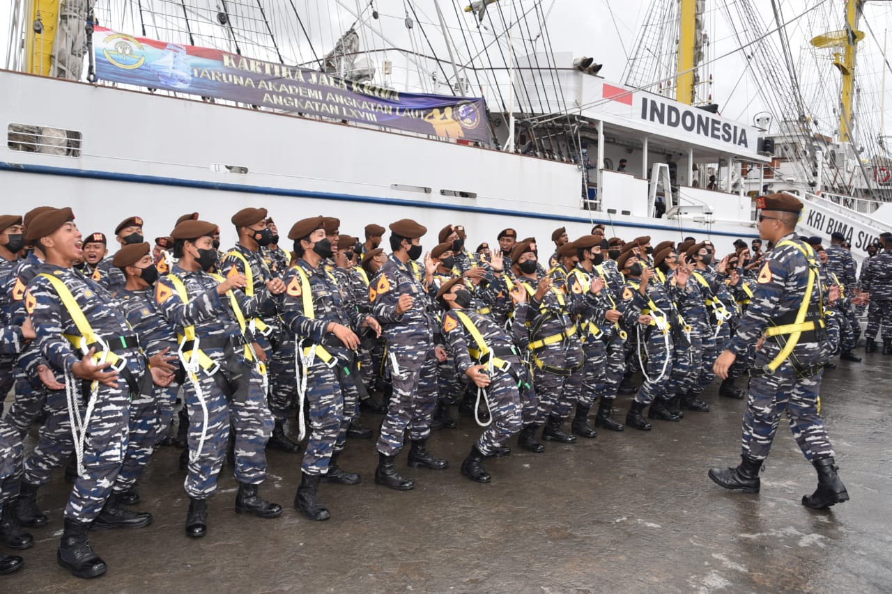 Bertolak melanjutkan pelayaran Etape-12 menuju Pelabuhan Benoa, Bali, 112 Taruna Akademi Angkatan Laut (AAL) Tingkat III Angkatan ke-68, Satuan Latihan Kartika Jala Krida (Satlat KJK) bersama KRl Bima Suci, meninggalkan Dermaga Pelabuhan Tanjung lntan, Pelindo III, Jl. Laut Jawa, Cilacap, Jawa Tengah setelah tiga hari sandar pada Senin (25/10) pagi.