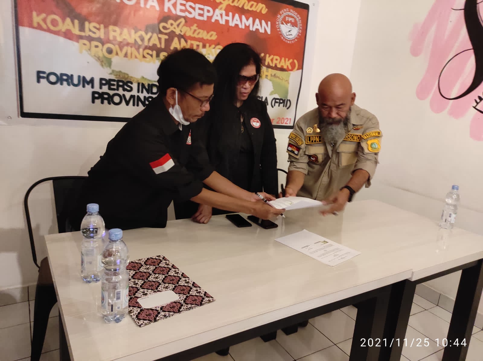 Bertempat dikantor pegiat anti korupsi yang beralamat di jalan Rajawali No.13 Kota Palu Provinsi Sulawesi Tengah, telah dilaksanakan penandatanganan Nota Kesepahaman ( MoU ) antara Koalisi Rakyat Anti Korupsi Indonesia (KRAK) Provinsi Sulawesi Tengah Harsono Bereki,S.Sos (Koordinator) dengan Forum Pers Independen Indonesia (FPII ) Sekretariat Wilayah Sulawesi Tengah Irfan Denny Pontoh,S.Sos (Ketua )