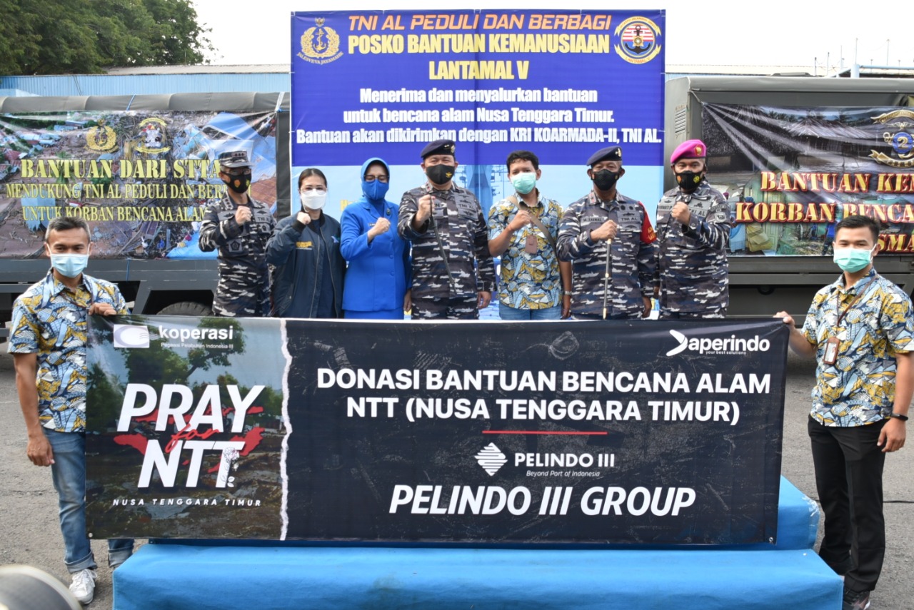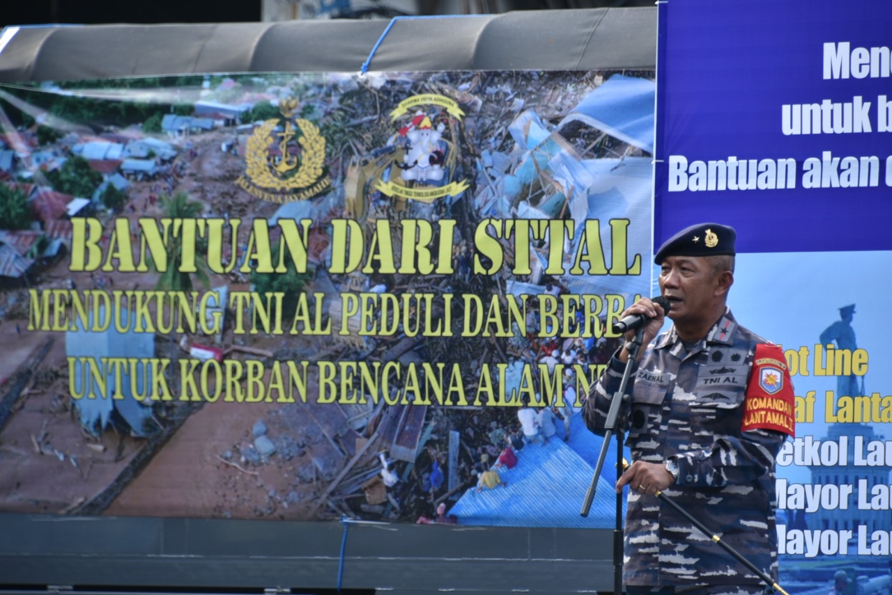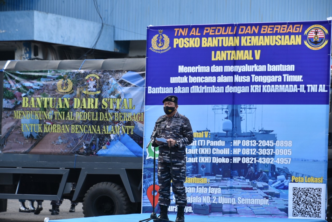 Komandan Sekolah Tinggi Teknologi Angkatan Laut (STTAL) Laksamana Pertama TNI Dr. Ir. Avando Bastari, M.Phil., di wakili Wadan STTAL Kolonel Laut (E) Maulana, S T., M.Si., dengan di dampingi Ka. LPPM STTAL bersama Pangkotama TNI AL wilayah Surabaya menyerahkan secara simbolis bantuan bencana alam NTT kepada penyelenggara Posko Bantuan Kemanusiaan Lantamal V yakni kepada Komandan Lantamal V Laksamana Pertama TNI Muhammad Zaenal, yang direncanakan besok akan diserahkan Komandan Lantamal V kepada Koarmada II yang