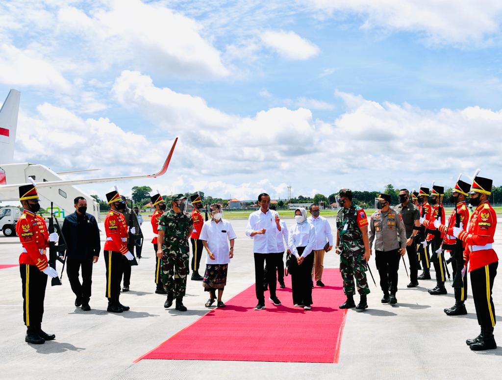 Komandan Pangkalan TNI AL (Lanal) Denpasar, Kolonel Laut (P) I Komang Teguh Ardana, S.T., M.A.P., mendampingi Gubernur Bali Wayan Koster menjemput kedatangan Presiden RI Ir. Joko Widodo di Bandara Internasional Ngurah Rai Bali, Kamis (2/12/2021).