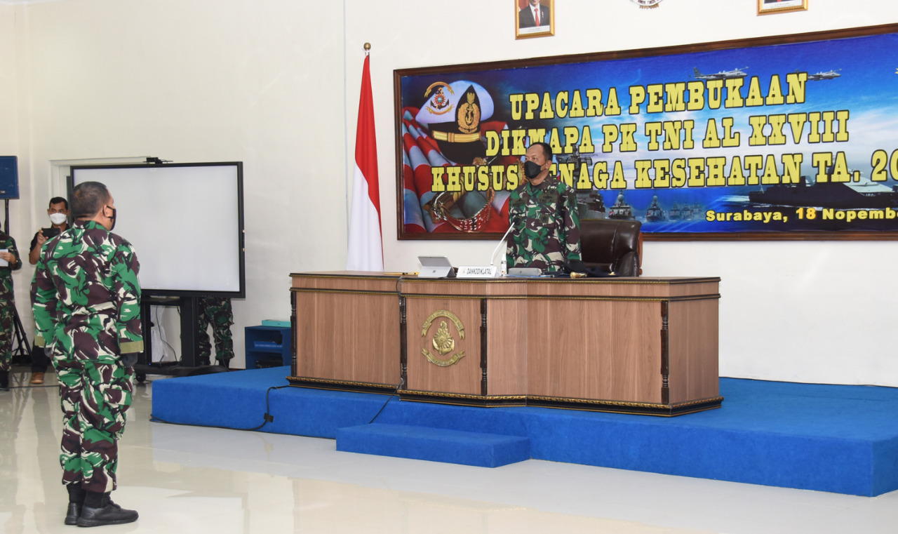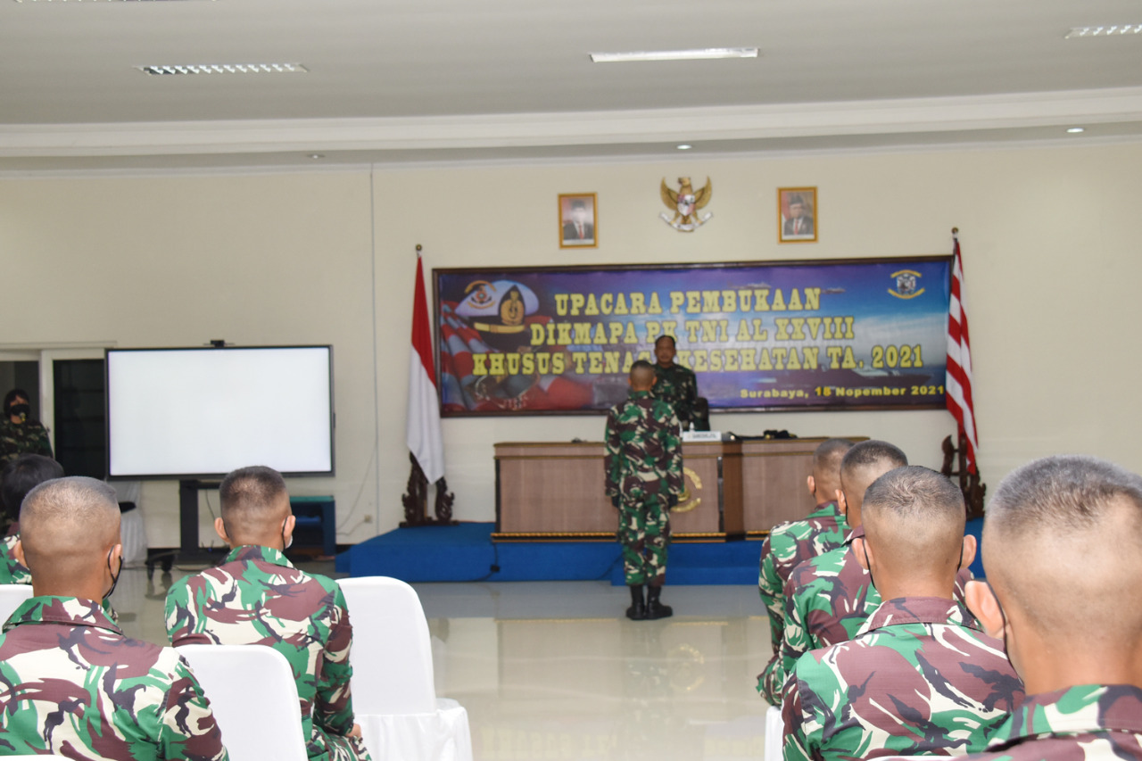 Komandan Komando Pembinaan Doktrin, Pendidikan dan Latihan TNI AL (Dankodiklatal) Laksamana Madya TNI Nurhidayat secara resmi membuka Pendidikan Pertama Perwira Prajurit Karier (Dikmapa PK) TNI Angkatan Laut Angkatan ke-28 Khusus Tenaga Kesehatan TA 2021 yang dilaksanakan di gedung Betelguese Pusat Pendidikan Lanjutan Perwira (Pusdiklapa) Kesatrian Kodiklatal Bumimoro Surabaya, Kamis, (18/11/2021).