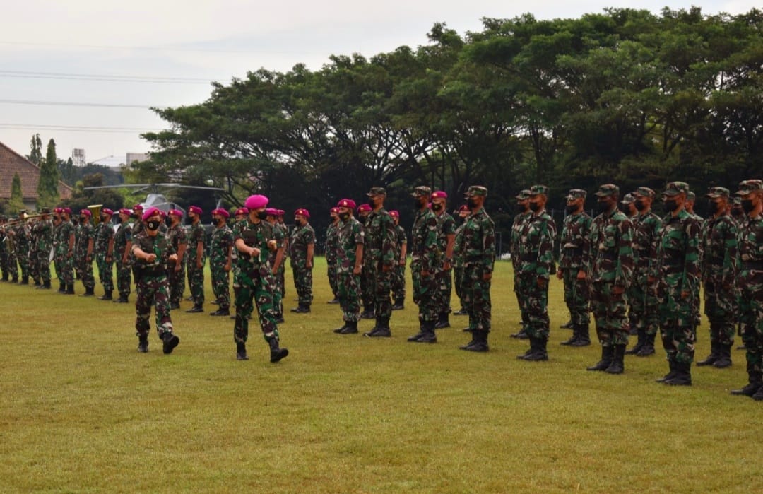 Komandan Komando Pendidikan Marinir (Dankodikmar) Brigadir Jenderal TNI (Mar) Ili Dasili, S.E. selaku inspektur upacara pembukaan siswa Pendidikan Pertama Tamtama (Dikmata) tahap dasar golongan lanjutan (Sargolan) kejuruan Infanteri angkatan 41 gelombang 2 T.A. 2021 di Lapangan Kesatrian Marinir Ewa Panggalila, Gunungsari, Surabaya. (17/04/2022).