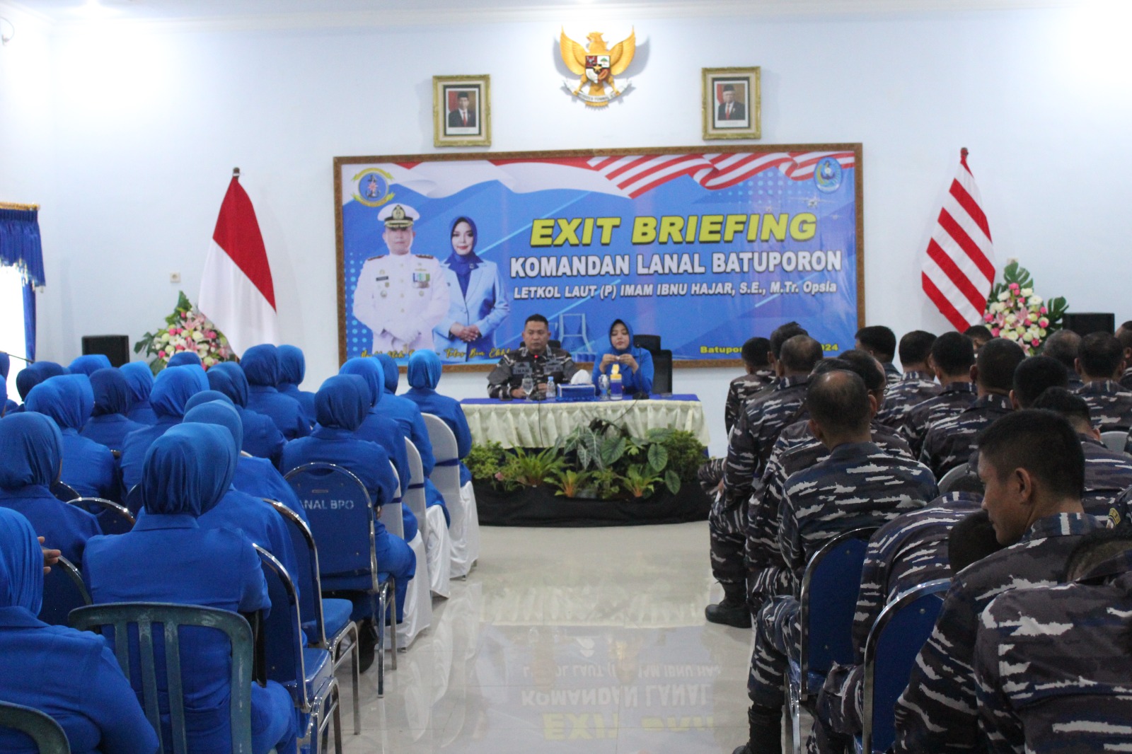 Menjelang berakhirnya masa jabatan di Lanal Batuporon, Komandan Pangkalan TNI AL (Danlanal) Batuporon Letkol Laut (P) Imam Ibnu Hajar, S.E., M. Tr. Opsla, melaksanakan exit briefing kepada jajarannya di ruang rapat Mako Lanal Batuporon Jl. Mawar No.33 Bangkalan-Madura. (23/04/2024).