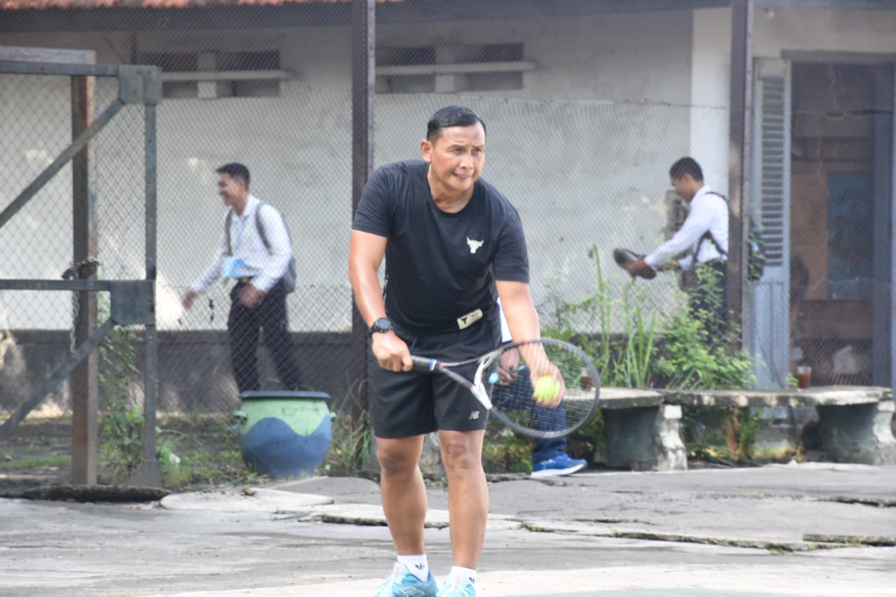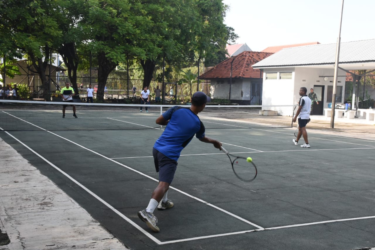 Komandan Pangkalan Utama TNI AL (Danlantamal) V Brigjen TNI Marinir Joni Sulistiawan, S. H., M. Han., melaksanakan olahraga tenis lapangan untuk menjaga kebugaran di Lapangan Tenis Komplek Pasiran, Ujung Surabaya. Jumat (02/02/2024)