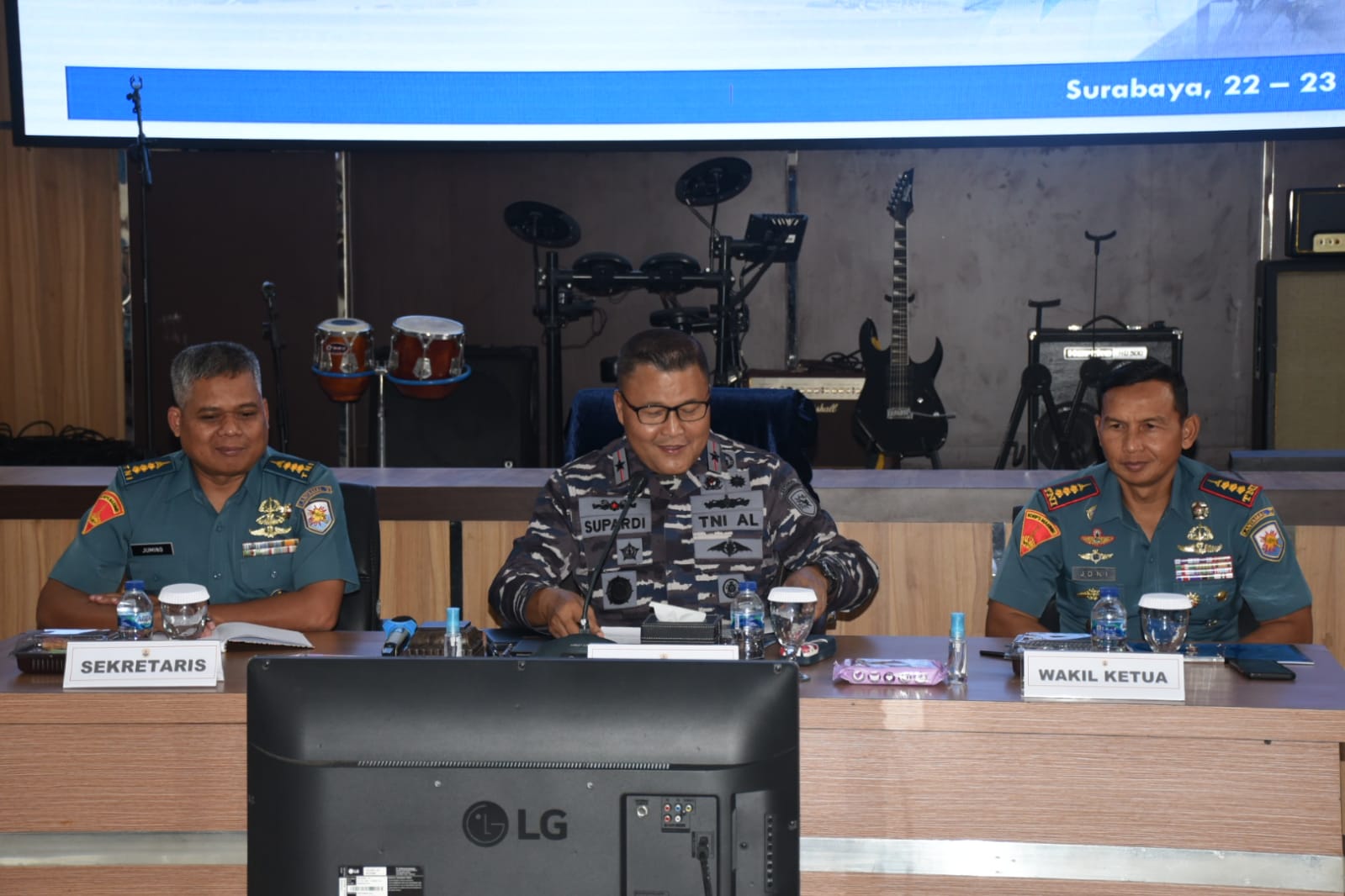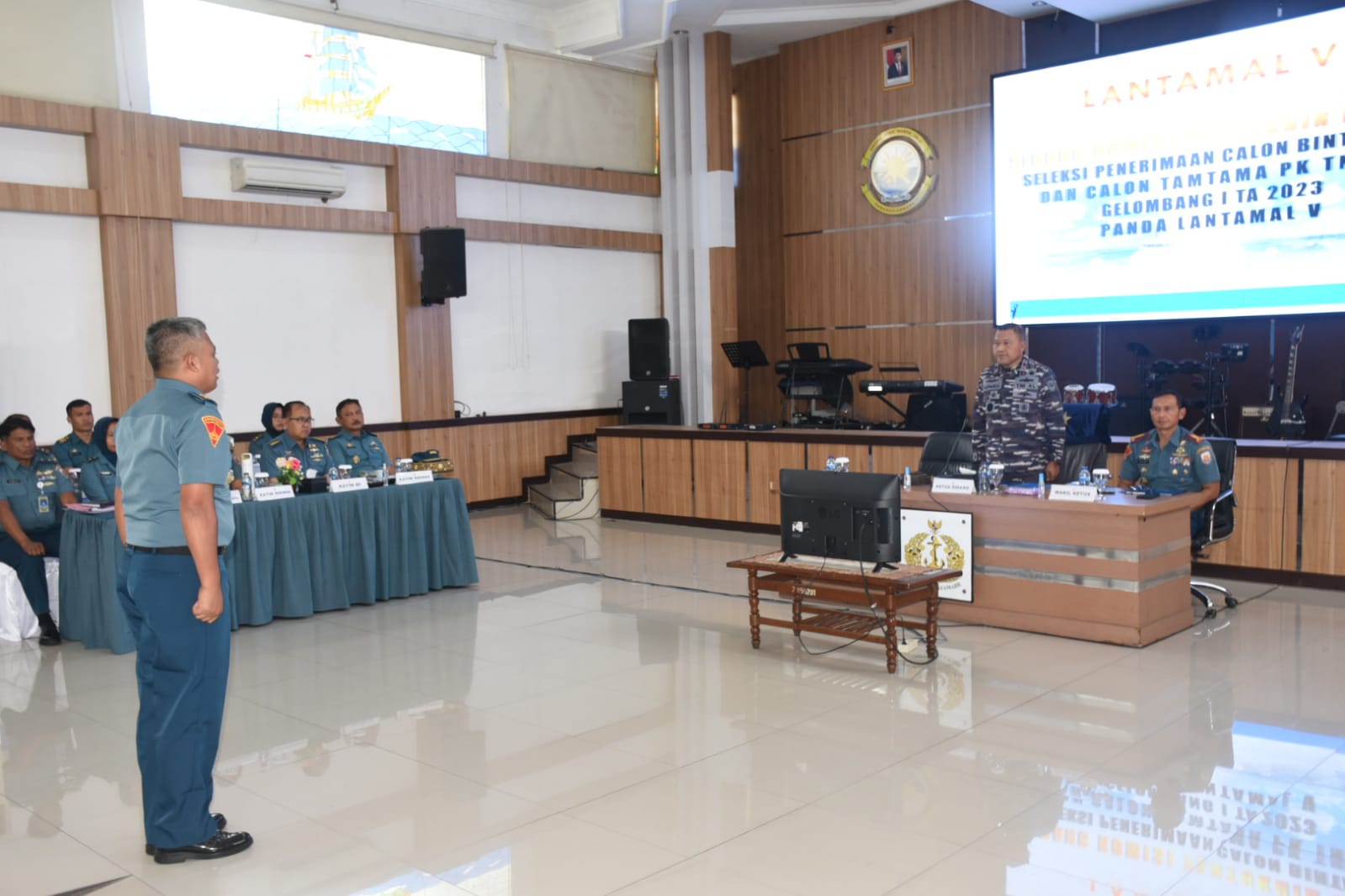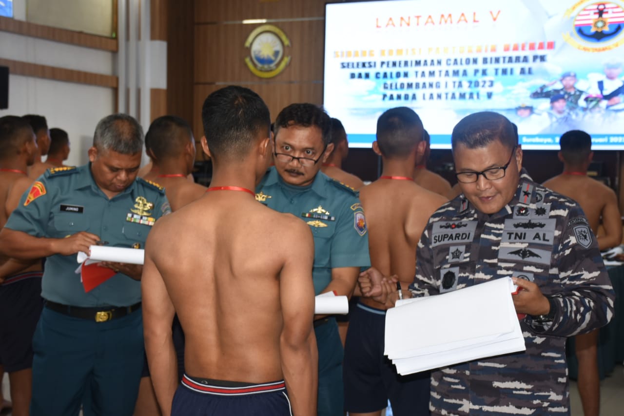 Komandan Pangkalan Utama TNI Angkatan Laut (Danlantamal) V Laksamana Pertama TNI Supardi memimpin sidang Panitia Penentuan Akhir (Pantukhir) Calon Tamtama Prajurit Karir (PK) TNI Angkatan Laut Gelombang I TA 2023 Panitia Daerah (Panda) Lantamal V, di Gedung Serba Guna (GSG) Mako Lantamal V, Perak, Surabaya, (22/02/2023).