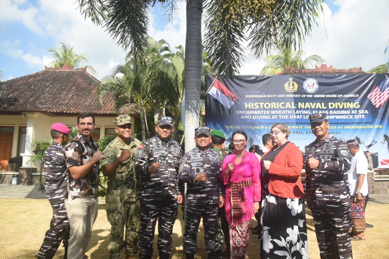 Komandan Pangkalan Utama TNI AL (Danlantamal) V Laksma TNI Dr. Arya Delano, S.E., M.Pd., M.Han., menghadiri kegiatan TNI Angkatan Laut bersama Kedutaan Besar Amerika melaksanakan penyelaman untuk memasang prasasti dan bendera kedua negara serta peletakan Karangan bunga di area Shipwreck (bangkai kapal) U.S A.T Liberty yang merupakan Kapal Perang Amerika yang ditembak torpedo Kapal Selam Jepang tahun 1942 Era Perang Dunia II di Perairan Laut Tulamben Bali. Kamis (17/04/2025)