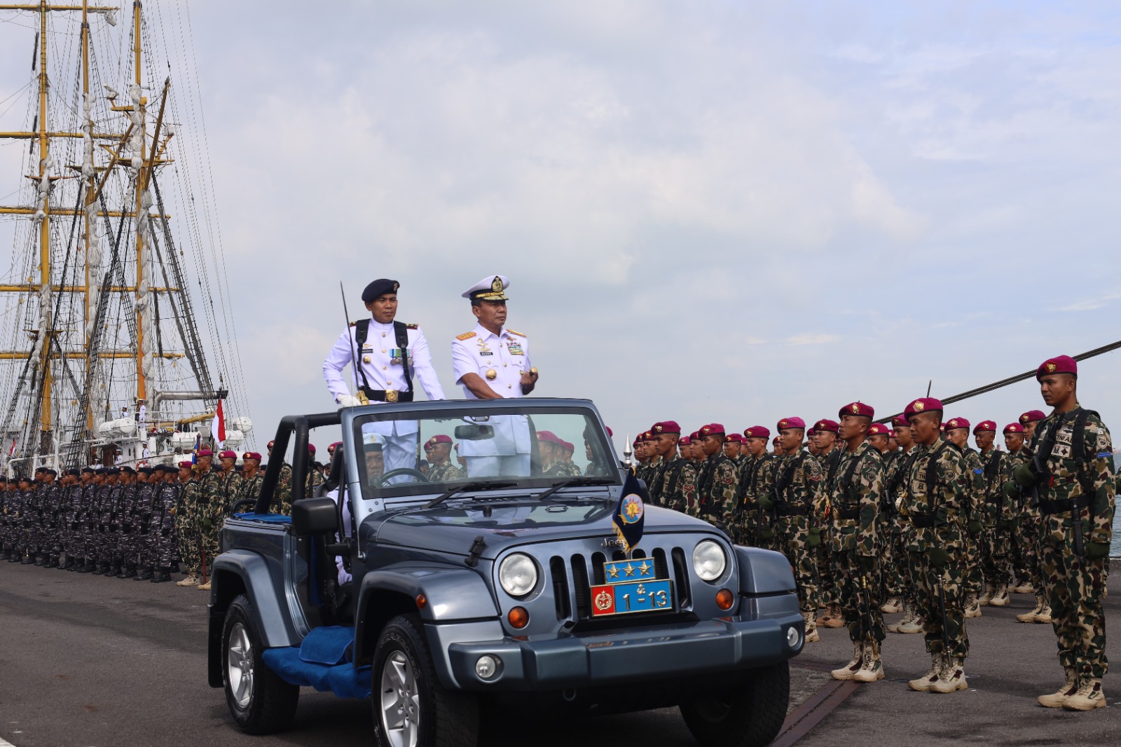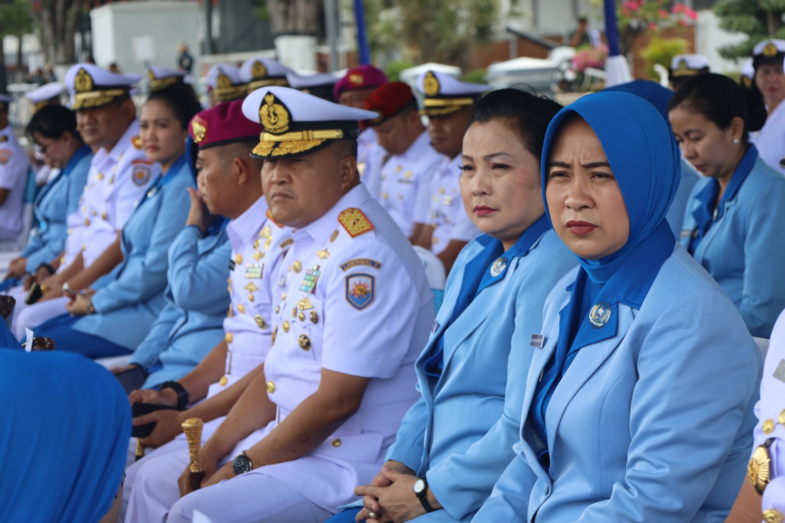 Komandan Pangkalan Utama TNI Angkatan Laut (Danlantamal) V Laksamana Pertama TNI Supardi didampingi Ketua Korcab V Daerah Jalasenastri Armada II Ny. Prima Supardi menghadiri Serah Terima Jabatan (Sertijab) Panglima Komando Armada (Pangkoarmada) II yang dipimpin oleh Panglima Komando Armada Republik Indonesia (Pangkoarmada RI) Laksamana Madya TNI Heru Kusmanto di Dermaga Madura, Ujung, Surabaya. Senin (27/02/2023).