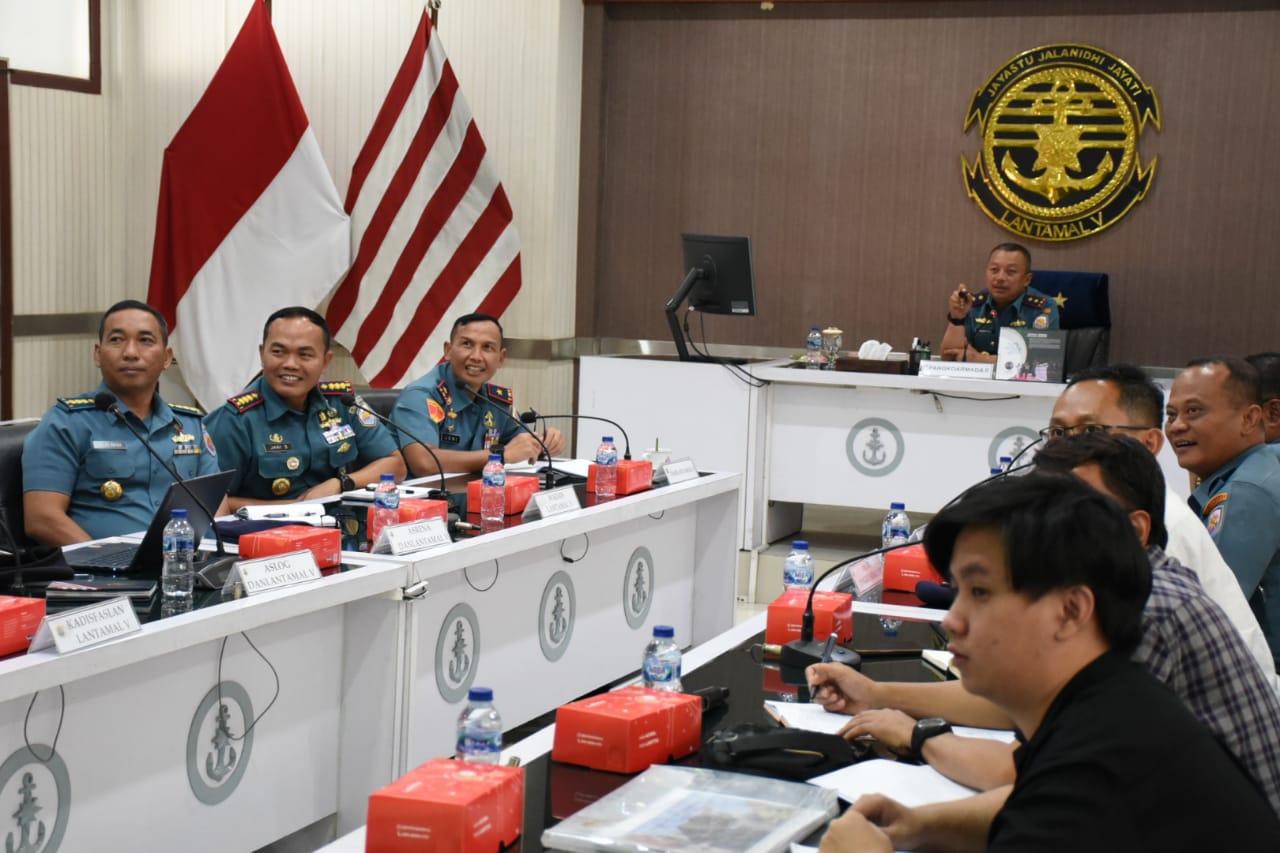 Komandan Pangkalan Utama TNI AL (Danlantamal) V Brigjen TNI (Mar) Joni Sulistiawan, S.H., M.Han menerima Kunjungan Pangkoarmada II Laksamana Muda TNI Ariantyo Condrowibowo, M.Tr.Opsla rapat di Mako Lantamal V, Perak, Surabaya. Senin (22/07/2024)