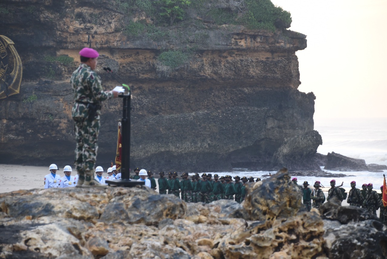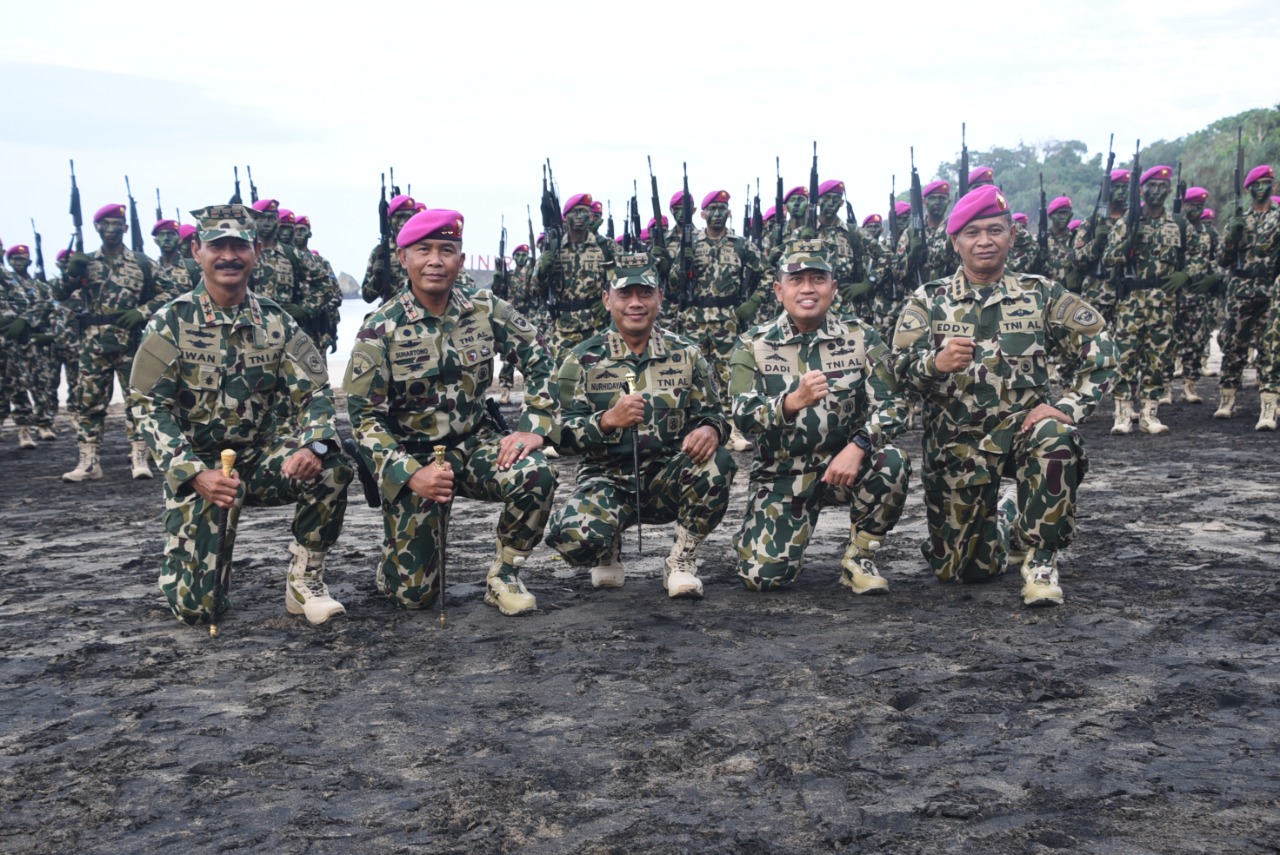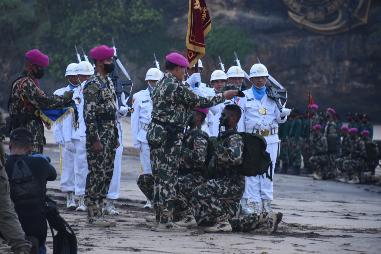 Komandan Komando Pembinaan Doktrin Pendidikan dan Latihan TNI AL (Dankodiklatal) Laksamana Madya TNI Nurhidayat menghadiri prosesi pembaretan 512 Prajurit Remaja Korps Marinir yang telah selesai melaksanakan pendidikan Komando di Komando Pendidikan Marinir (Kodikmar) Kodiklatal. Adapun prosesi pembaretan tersebut dipimpin langsung Kasal Laksamana TNI Yudo Margono di Pantai Baruna Kondang Iwak Malang Selatan. Selasa (7/12/2021).