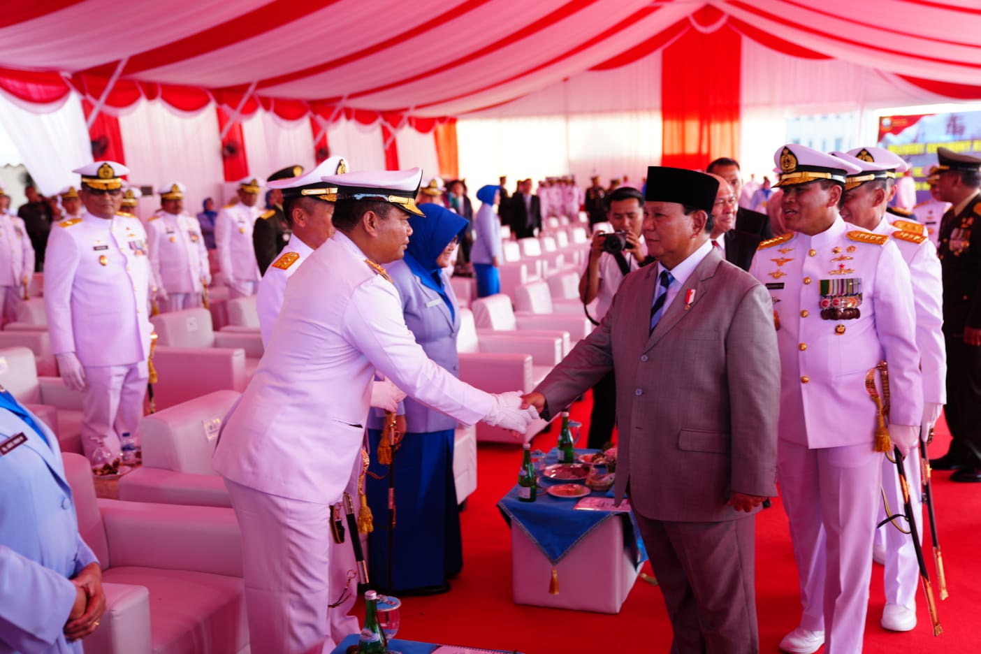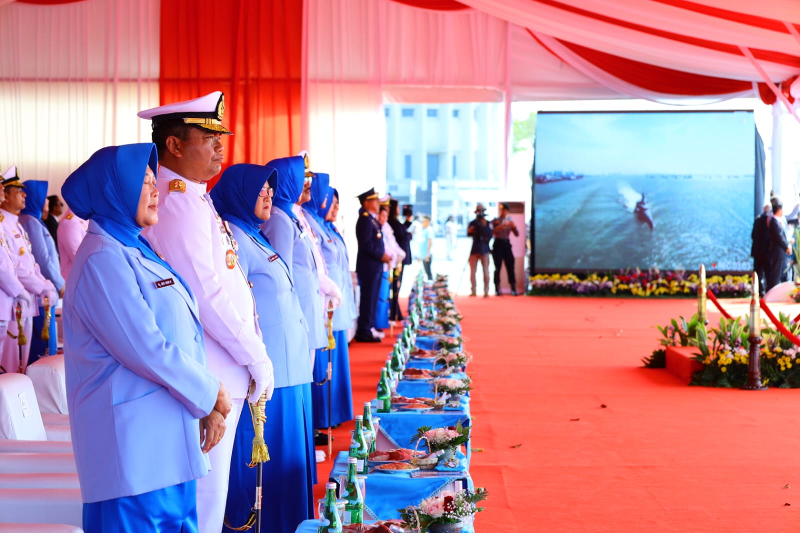 Komandan Pusat Penerbangan TNl Angkatan Laut (Danpuspenerbal) Laksda TNl Dr. Imam Musani beserta istri menghadiri Delivery Ceremony 5 unit Kapal Cepat Rudal (KCR) 60 meter oleh Menteri Pertahanan RI Prabowo Subianto dalam bentuk sailing pass di Dermaga Madura Koarmada II, Ujung, Surabaya, Senin (14/8/2023).