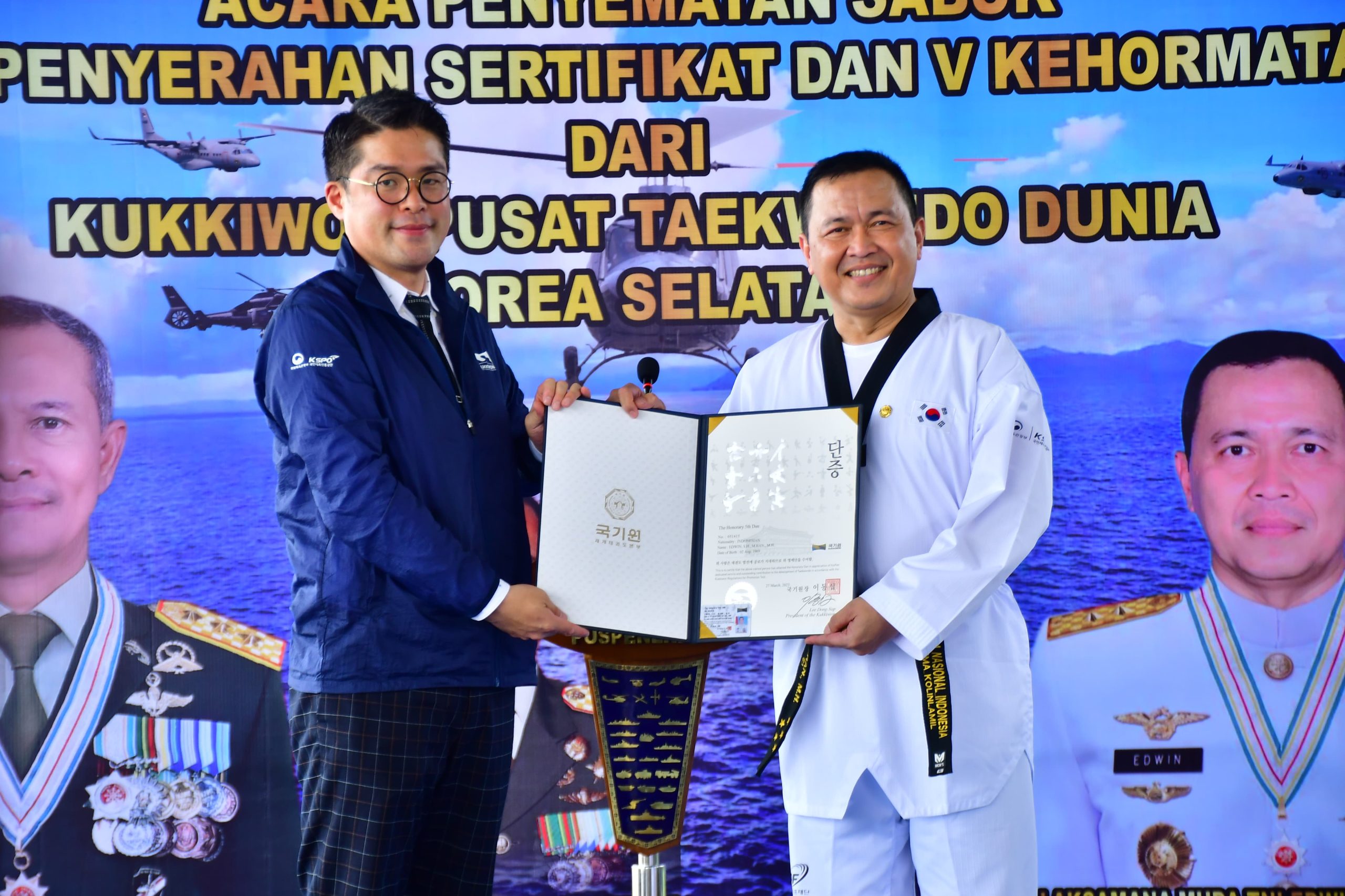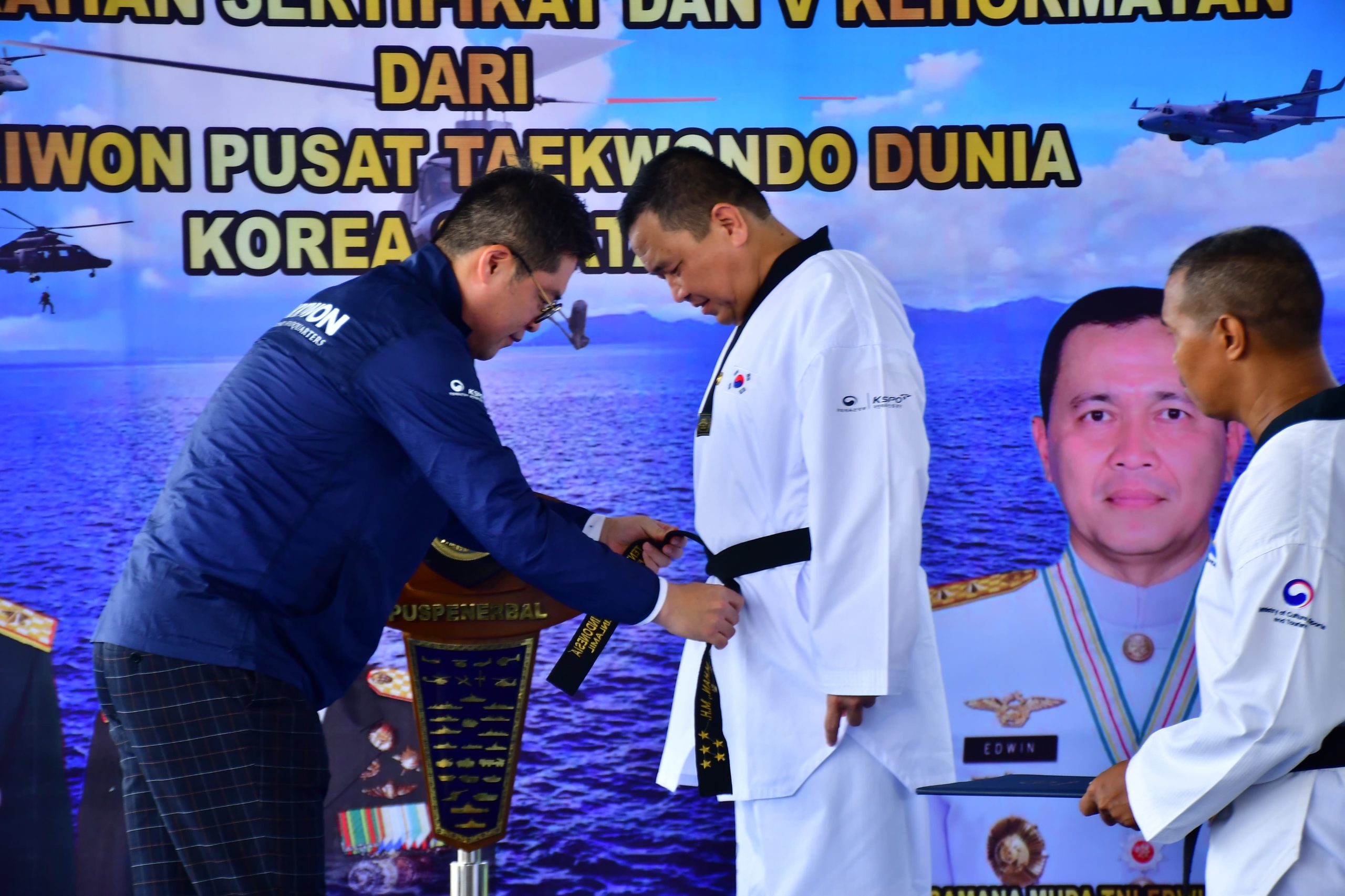 Asisten Perencanaan Umum (Asrenum) Panglima TNl, Laksda TNl Edwin menerima sertifikat dan penyematan sabuk kehormatan DAN V dari Kukkiwon Pusat Taekwondo Dunia Korea Selatan yang dilangsungkan di Shelter Skuadron 400 “Sarang Gurita” Wing Udara 2 (WU2) Puspenerbal Juanda, Sabtu (9/3/2024).