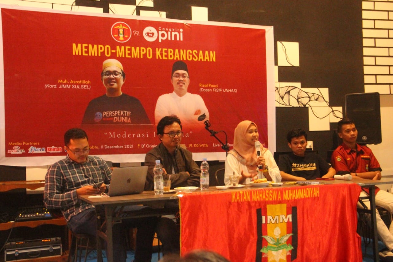 Kegiatan mempo-mempo dilaksanakan di D’Original Coffe dengan mengundang dua pembicara, yaitu Muh. Asratillah (Kordinator Jaringan Intelektual Muda Muhammadiyah Sulsel) dan Rizal Pauzi (dosen Fisipol Unhas). Dalam pemaparan mereka, keduanya bersepakat bahwa moderasi agama dapat diterima dan kokoh apabila pemerintah dan masyarakat sejahtera secara ekonomi.