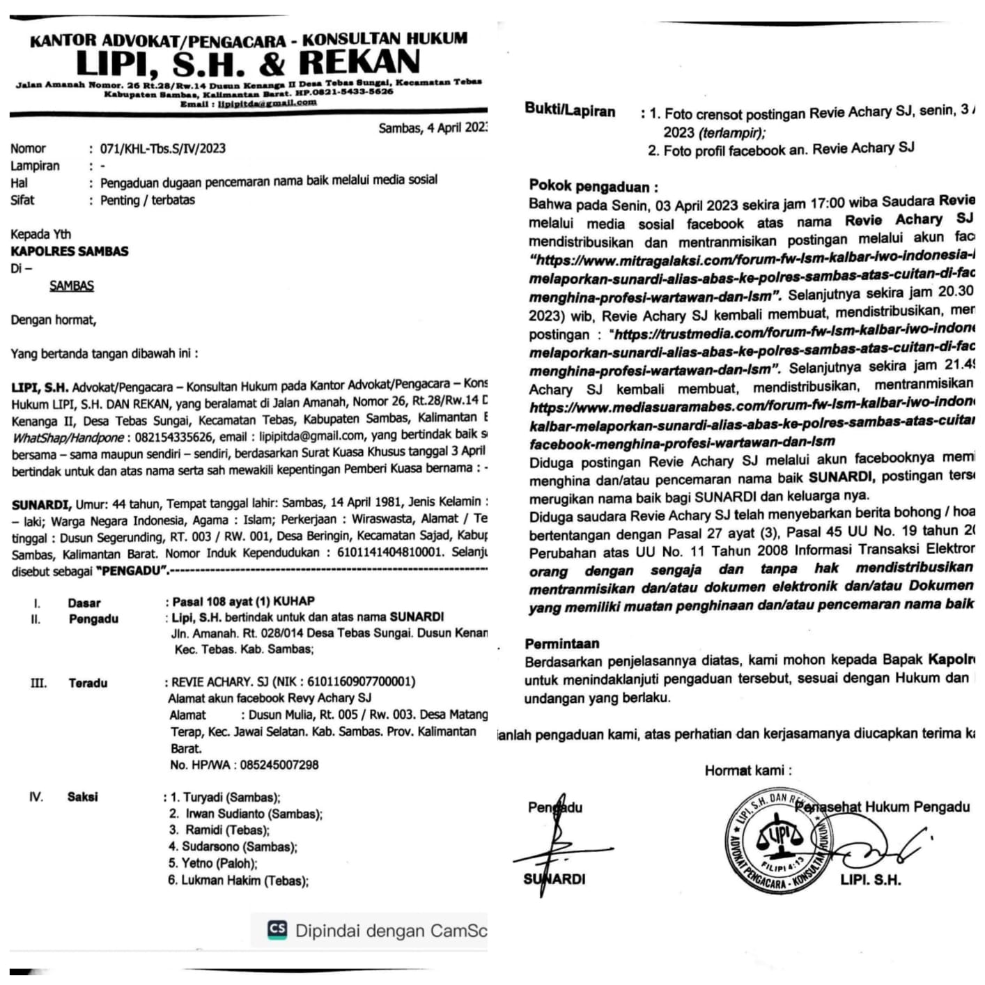 “Sementara itu, Revie A selaku Ketua DPD IWO INDONESIA Kabupaten Samba, dengan tegas mengatakan bahwa postingan dari saudara Sunardi, medsos Facebook tersebut telah menghina Profesi Wartawan dan LSM dalam cuitan nya tersebut, menurut Revie A, untuk sakarang kami dari berbagai Awak Media, Lsm dan beberapa Awak Media yang tergabung di dalam Organisasi Ikatan Wartawan Online Indonesia ( IWO INDONESIA) mendatangi kantor Polres Sambas untuk membuat laporan, dan kami berharap agar Polres Sambas dapat memanggil saudara Sunardi alias Abas untuk mempertanggung jawabnya atas cuitan postingannya di facebook tersebut, yang diduga sudah membuat resah Awak Media dan teman- teman LSM ” Ungkapnya.
