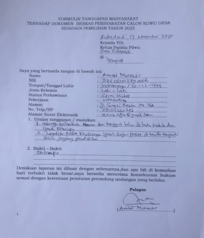 Berdasarkan informasi yang didapat awak media News Investigasi-86, kalau warga Desa Sidadadi, berinisial AM (46) telah memberikan surat Kepada Ketua Panitia Pilkades (Pilwu) Desa Sidadadi. Pada tanggal 13 November 2025.