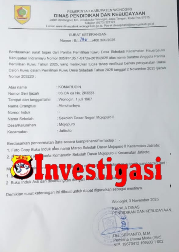 Mengingat dokumen ijazah Sekolah Dasar Negeri (SDN) Komarudin berasal dari SDN Mojopuro II Desa Mojopuro, Kecamatan Jatiroto, Kabupaten Wonogiri, Jawa Tengah. Yang diindikasi nama orang lain.