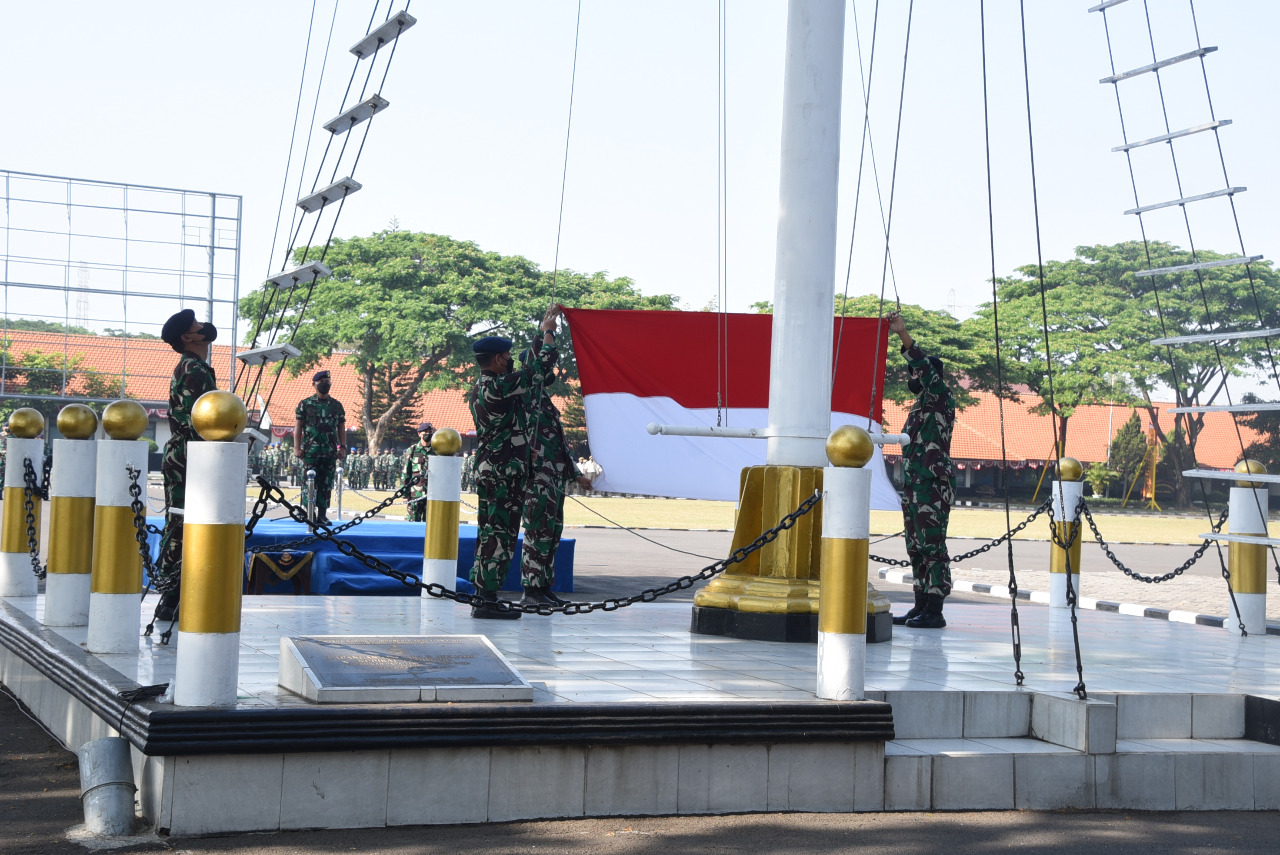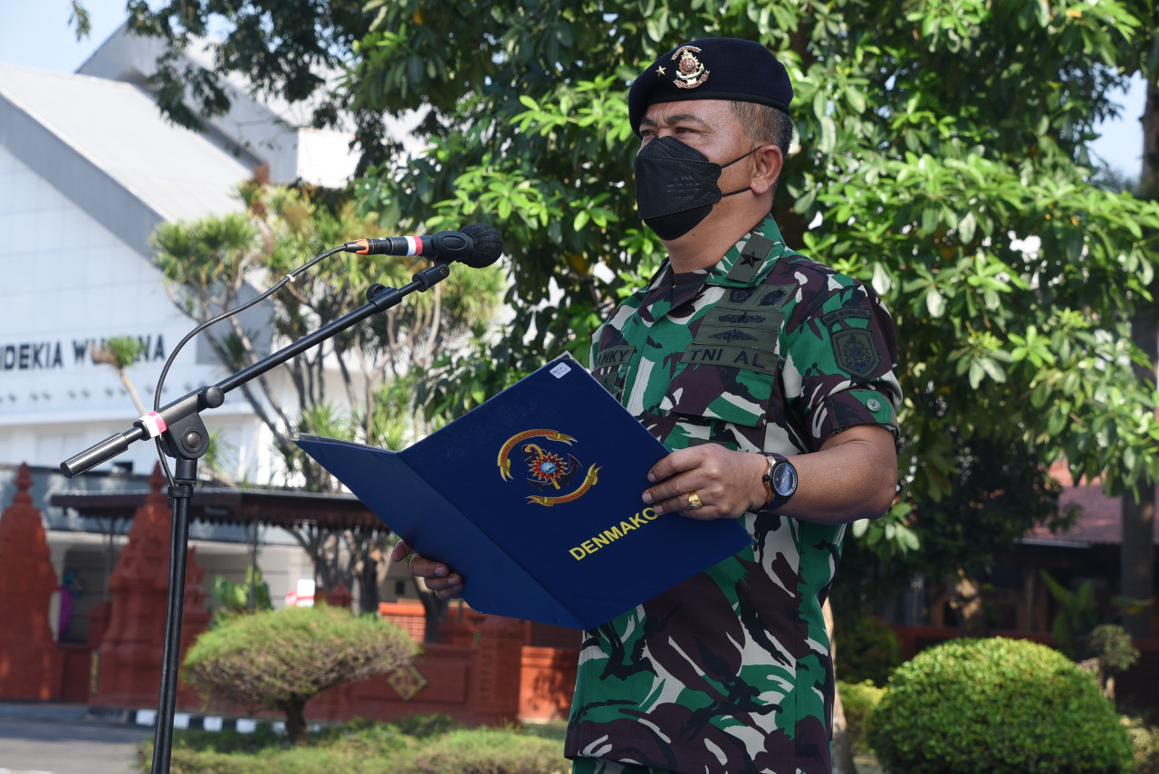 Direktur Doktrin Komando Pembinaan Doktrin Pendidikan dan Latihan TNI AL (Kodiklatal), Laksma TNI May Franky Pasuna Sihombing memimpin upacara penaikan bendera yang digelar di Lapangan Laut Maluku Kesatrian Kodiklatal Bumimoro Surabaya, Senin (29/8).