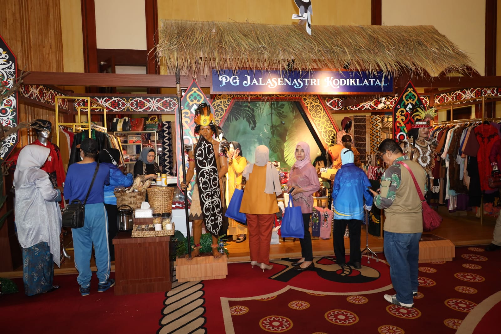 Di stand nomor 1 dan 2 milik PG Jalasenastri Kodiklatal yang tampil maksimal dengan nuansa khas Kalimantan, memamerkan beragam produk menarik mulai dari kain batik dan baju batik bermotif Borneo Kalimantan, juga ada tas-tas unik, aksesoris kalung dan gelang, mukena batik, juga ada produk makanan, snack hingga frozen food.