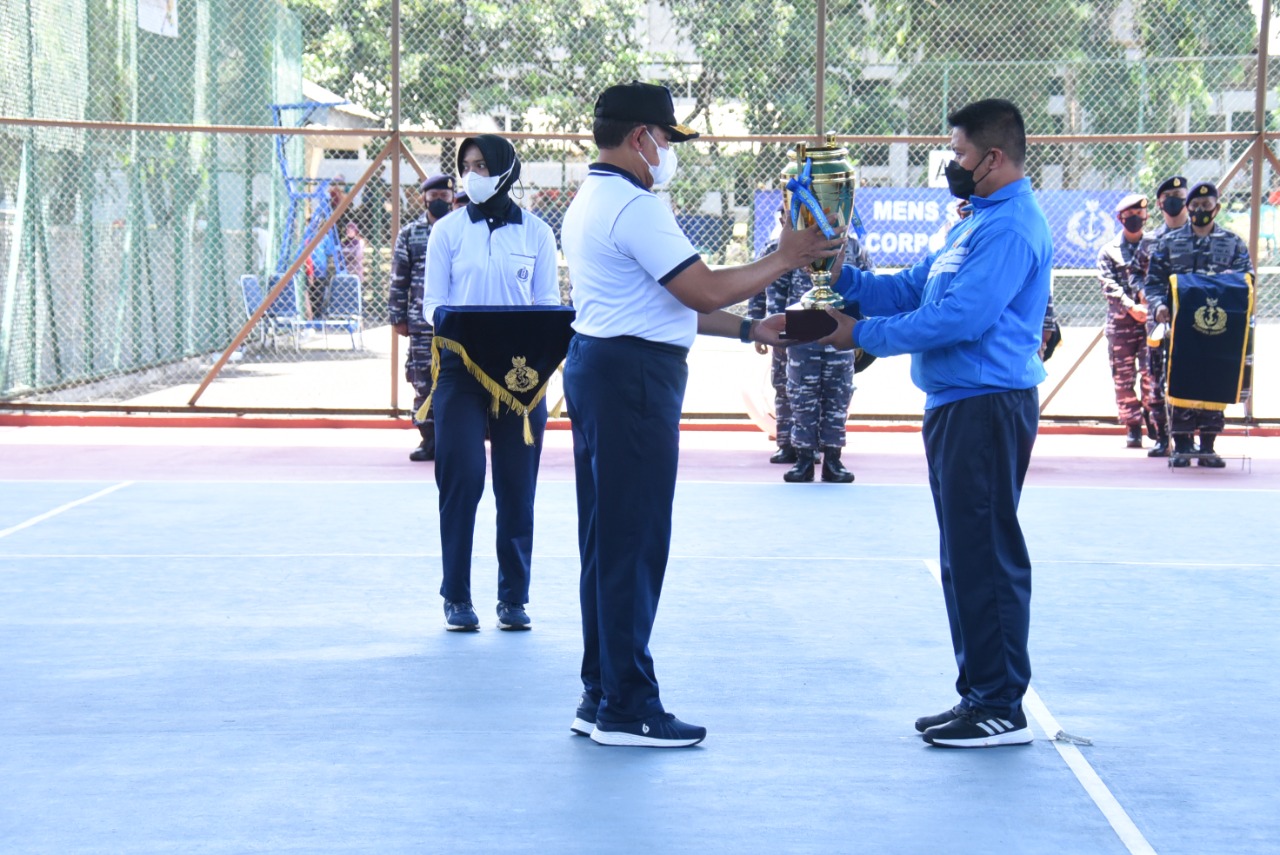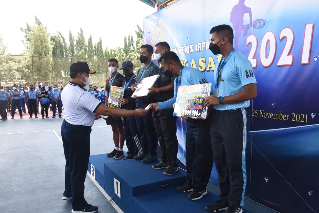 Kepala Departemen Teknik (Kadeptek) AAL, Kolonel Laut (T) Hamzah, S.E., M.Tr.Hanla, M.M. selaku Pembina Yanus Tenis AAL, mewakili Gubernur AAL, Mayjend TNI (Mar) Nur Alamsyah, S.E., M.M., M.Tr (Han) menerima Piala Juara Umum yang diserahkan Kasal.