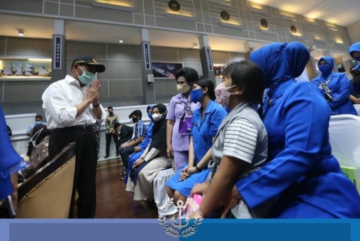 Kedatangan Menko PMK dan Mensos ini, didampingi Ketum Dharma pertiwi Ny. Nanny Hadi Tjahjanto dan Ketum Jalasenastri Ny. Vero Yudo Margono diterima di ruang Lounge Mojopahit, Koarmada ll.
