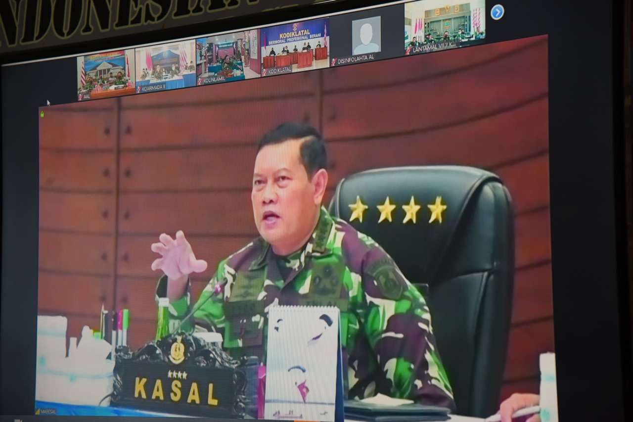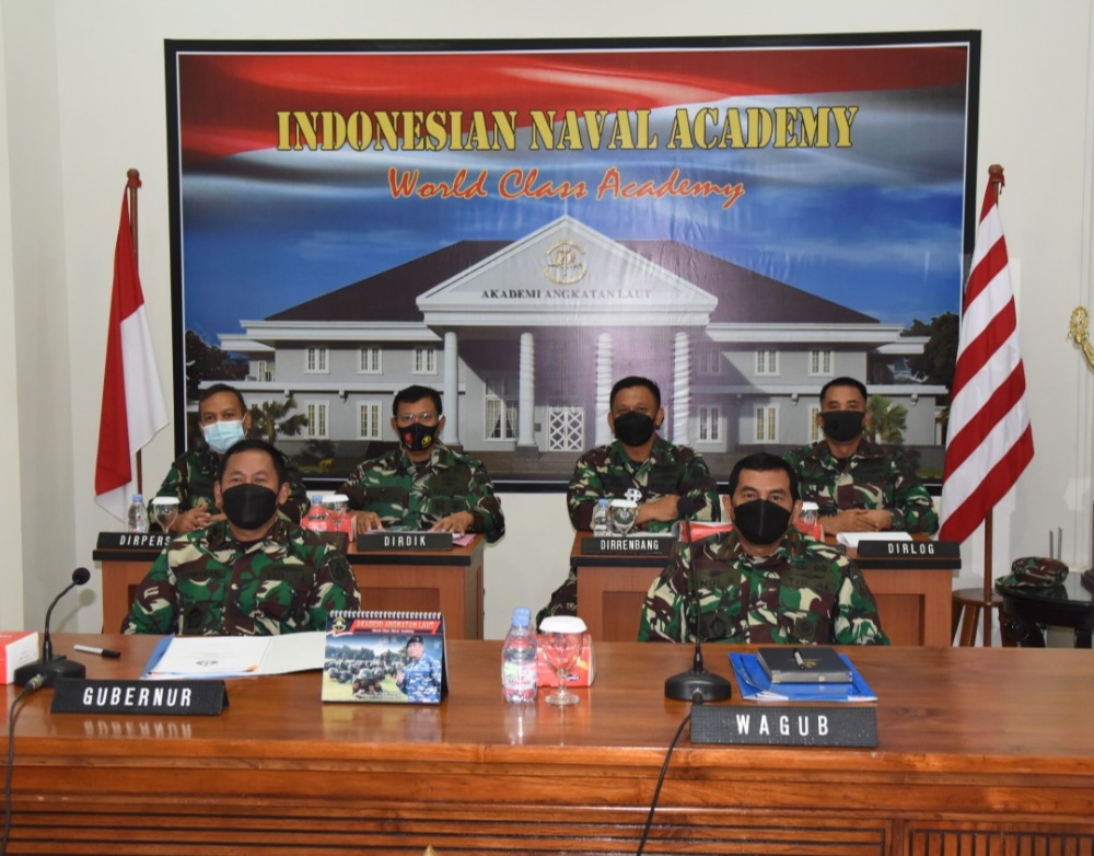 Gubernur Akademi Angkatan Laut (AAL) Laksamana Muda TNI Tunggul Suropati, S.E., M.Tr (Han) didampingi Wagub AAL Brigjen TNI (Mar) Endi Supardi, S.E., M.Tr.Opsla dan Pejabat Utama AAL mengikuti Focus Group Discussion (FGD) Pembentukan Koarmada RI secara virtual di Ruang Vicon, Gedung R.Soebijakto, Kesatrian AAL, Surabaya, Senin (15/3).