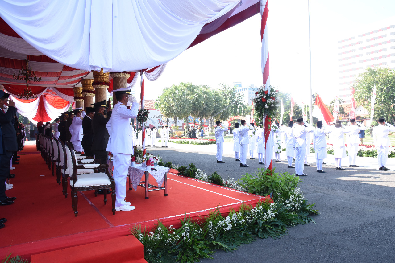 Gubernur Jawa Timur Khofifah Indar Parawansa memimpin upacara memperingati Hari Ulang Tahun (HUT) ke-76 Rl sebagai inspektur di halaman Gedung Negara Grahadi di Surabaya yang hanya diikuti 40 orang dengan protokol kesehatan ketat.