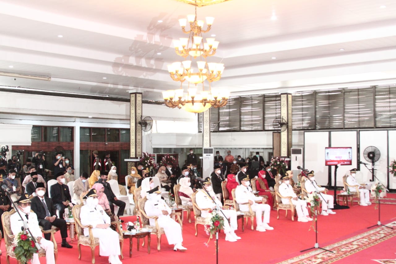 Pada kesempatan ini, gubernur menyampaikan pesan kepada seluruh bupati dan wakil bupati yang hadir secara virtual maupun yang hadir langsung, baik yang lama maupun yang baru dilantik.