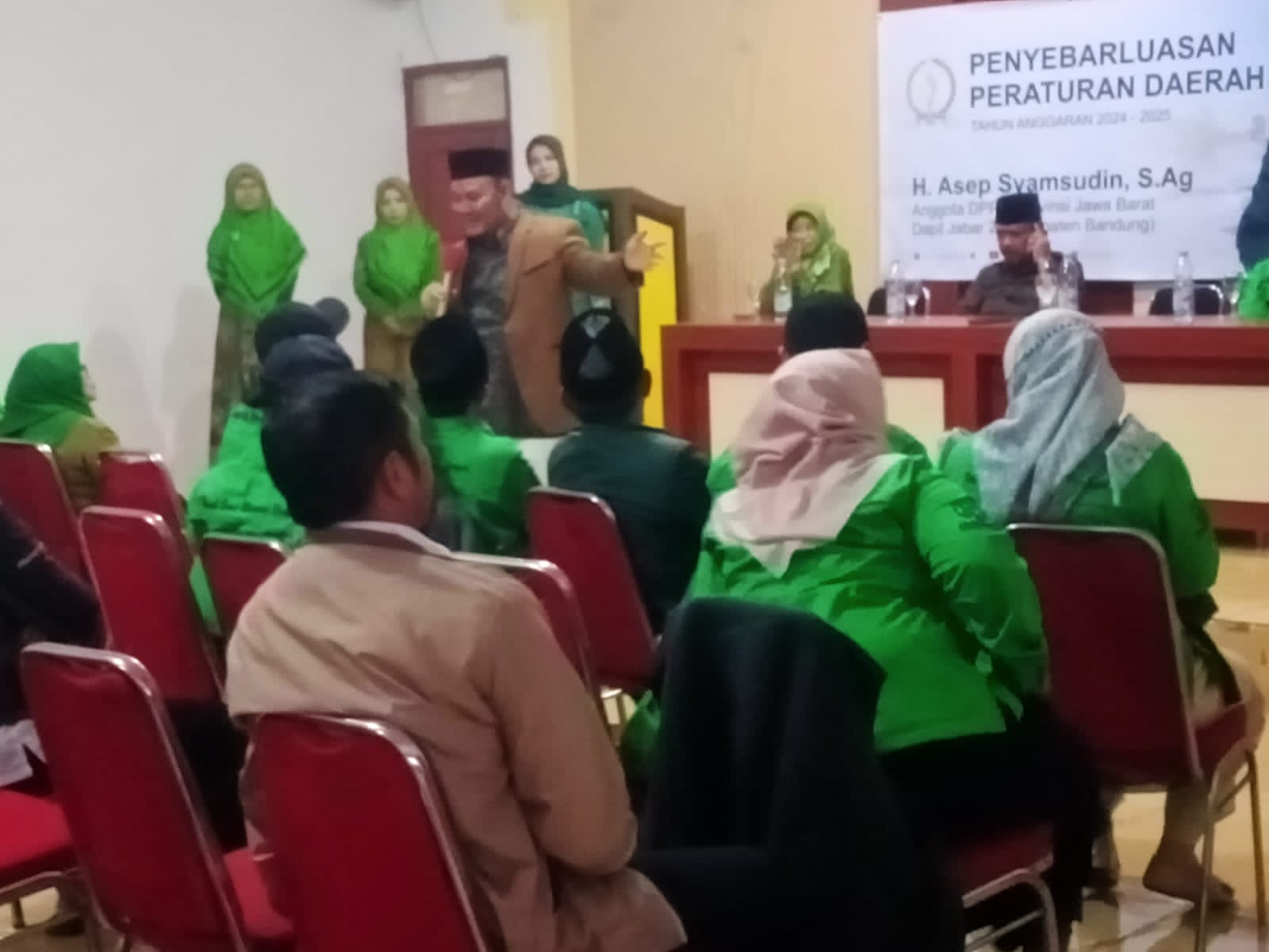 H. Asep Syamsudin anggota Dewan Provinsi Jawa Barat dari Fraksi PKB Mensosialisasikan Perda No 2 Tahun 2023 kepada Kader Muslimah NU dan Masyarakat yang dilaksanakan pada hari Rabu 24 September 2025 di Aula Desa Jagabaya Kecamatan Cimaung Kabupaten Bandung.