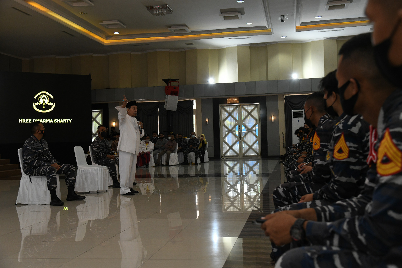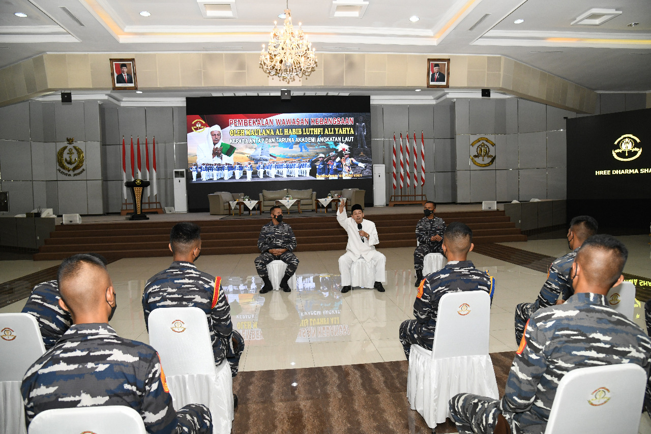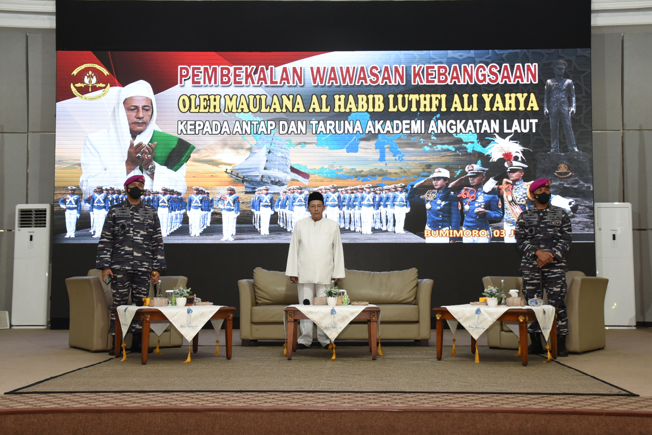 Ulama kharismatik asal Pekalongan, Maulana Habib Luthfi bin Yahya, memberikan pembekalan wawasan kebangsaan kepada prajurit dan Taruna Akademi Angkatan Laut (AAL) yang digelar di Gedung Mas Pardi, Kesatrian AAL Bumimoro, Surabaya, Kamis (3/6).