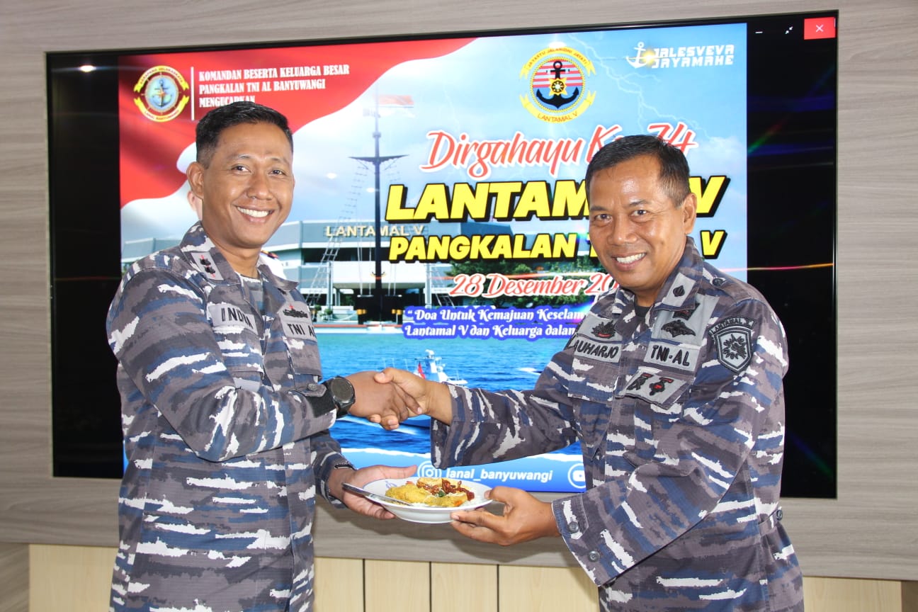 Dalam sambutannya Danlanal Banyuwangi menyampaikan, “kegiatan pemotongan tumpeng ini dilaksanakan serentak di Lanal-Lanal dibawah jajaran Lantamal V, harapannya di hari ulang tahun ke-74 tahun ini semoga Lantamal V senantiasa diberikan keberkahan, keselamatan dan kesuksesan,” Ucapnya.