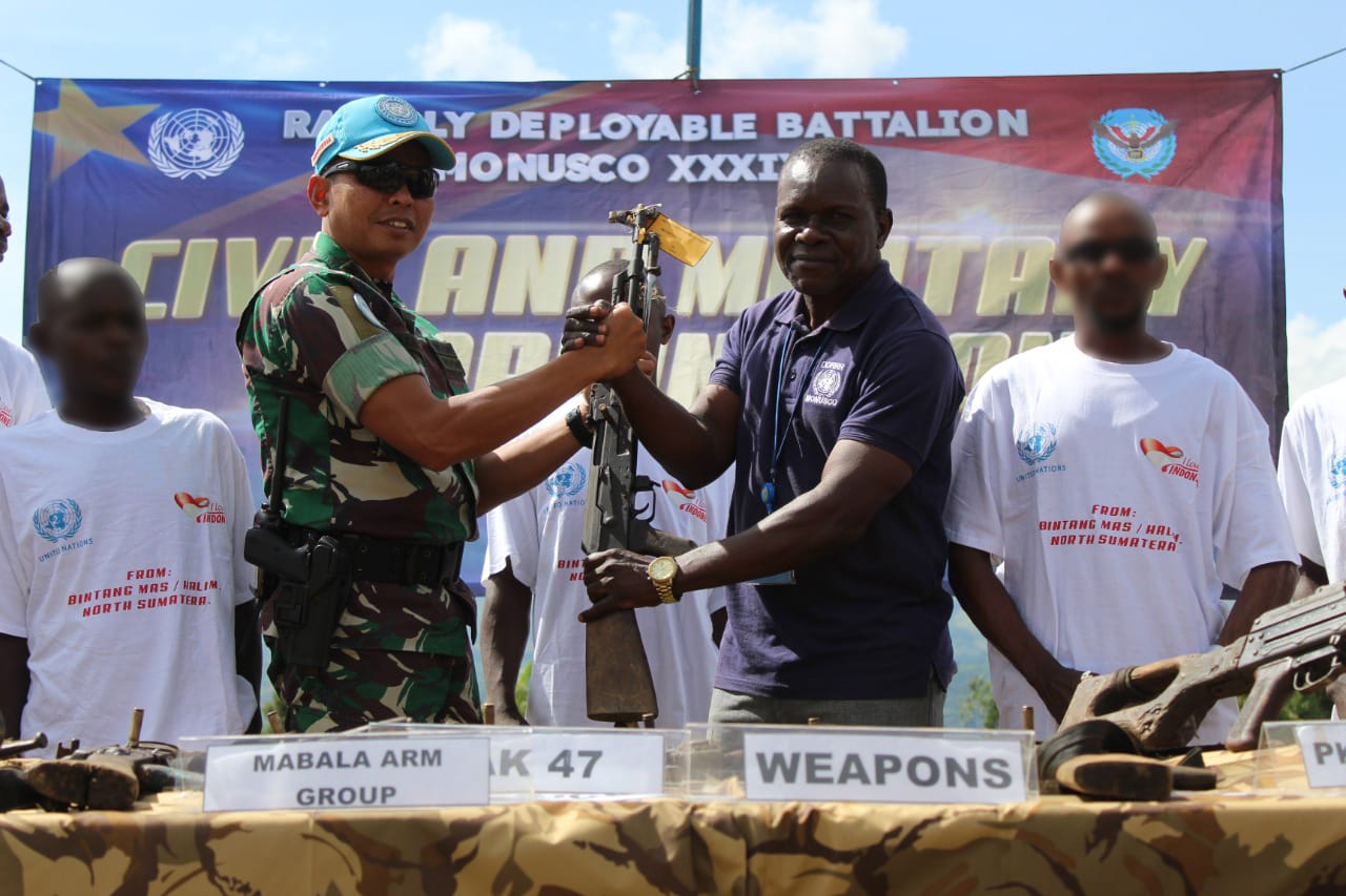 Satgas Batalyon Gerak Cepat (BGC) Konga TNI XXXIX-D/Monusco memfasilitasi penyerahan diri kelompok milisi RM Mabala pimpinan Mr Justin Mabala kepada Disarmament Demobilization Repatriation (DDR) di Desa Nyalubemba yang berjarak sekitar 77 Km dari Combat Operation Base (COB) Walungu, Kongo Afrika, Selasa (10/5/2022).