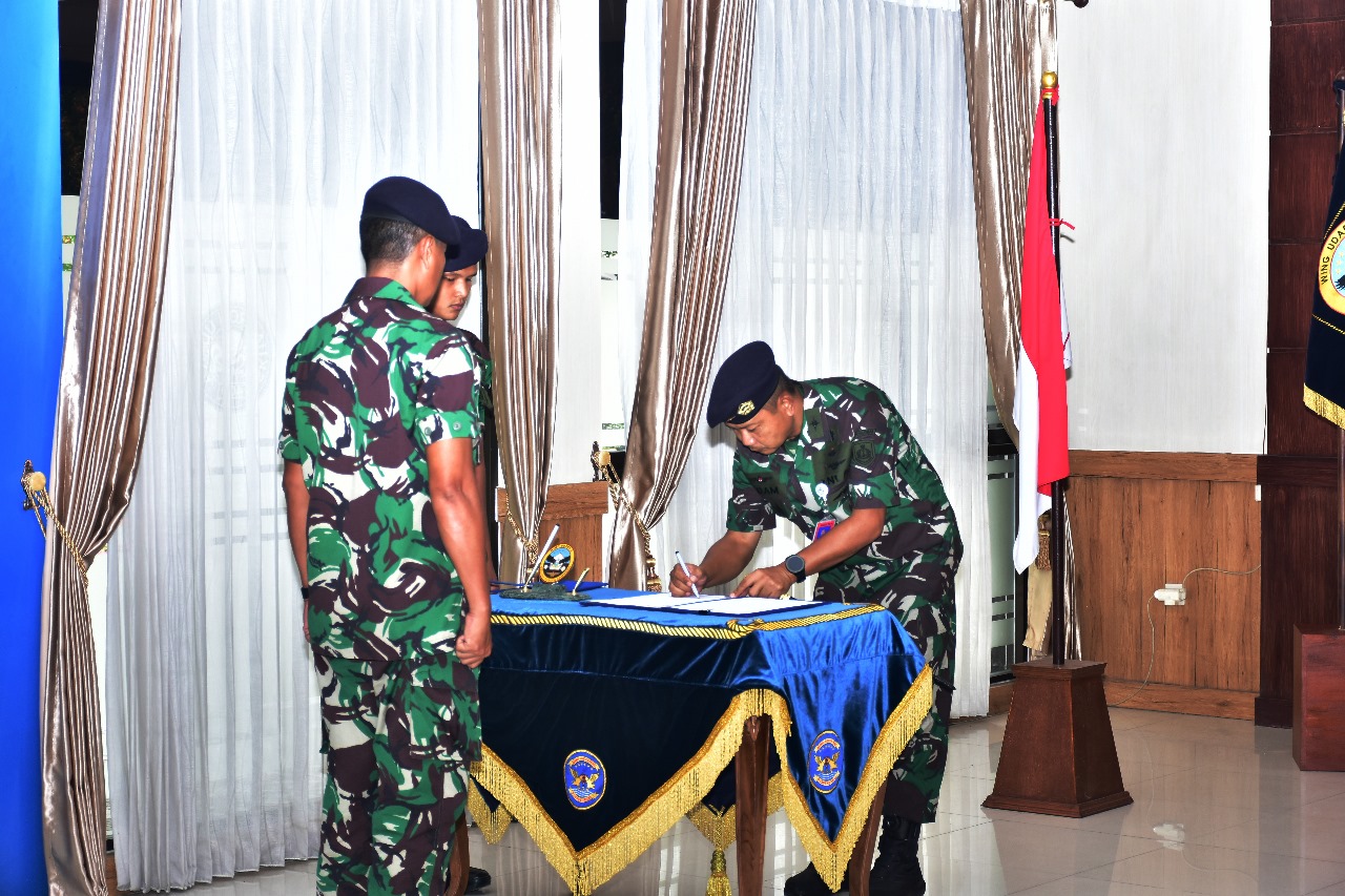 Mendapat promosi jabatan baru di Mabes TNI, Letkol Laut (S) Umar Ismail menyerahkan jabatan Perwira Staf Program dan Anggaran (Pasproga) Wing Udara 2 Puspenerbal kepada Komandan Wing Udara 2 Puspenerbal, Kolonel Laut (P) Adam Firmansyah di Lobby Markas Komando Wing Udara 2 Puspenerbal, Juanda, Jum’at (2/2/2024).