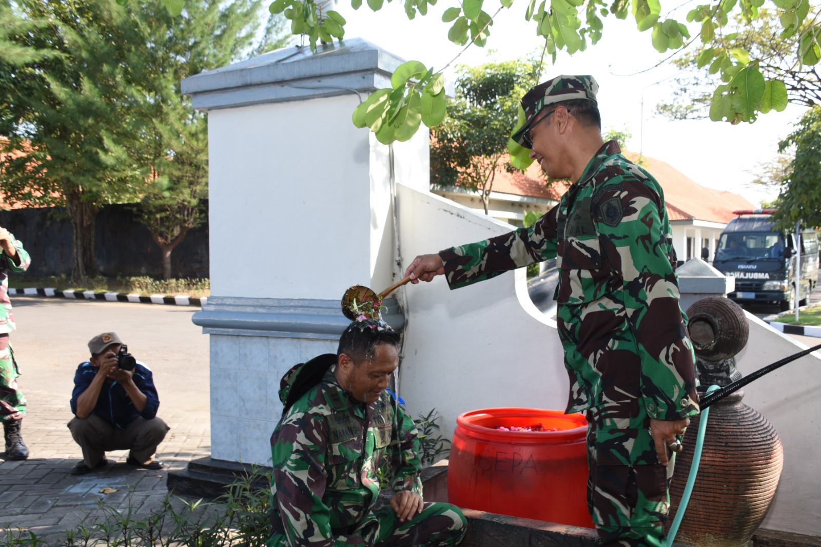Dalam kegiatan tradisi tersebut seluruh Pasis yang terdiri dari 23 orang Pasis Pendidikan Spesialisasi Perwira (Dikspespa) Suplai dan 4 orang Pasis Dikspespa Hukum, lebih dulu menjalani tradisi siraman yakni kepala dan tubuh mereka disiram air kembang oleh Komandan Pusdikbanmin Kolonel Laut (S) I Made Gede B, S.H.,M.H.