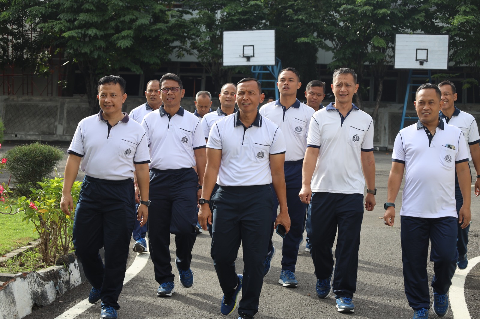 Komandan Pangkalan TNI AL (Danlantamal) V Brigjen TNI Marinir Joni Sulistiawan, S. H., M. Han., bersama para pejabat utama Lantamal V melaksanakan olahraga pagi di Mako Lantamal V, Perak Surabaya. Jumat (19/01/2024).